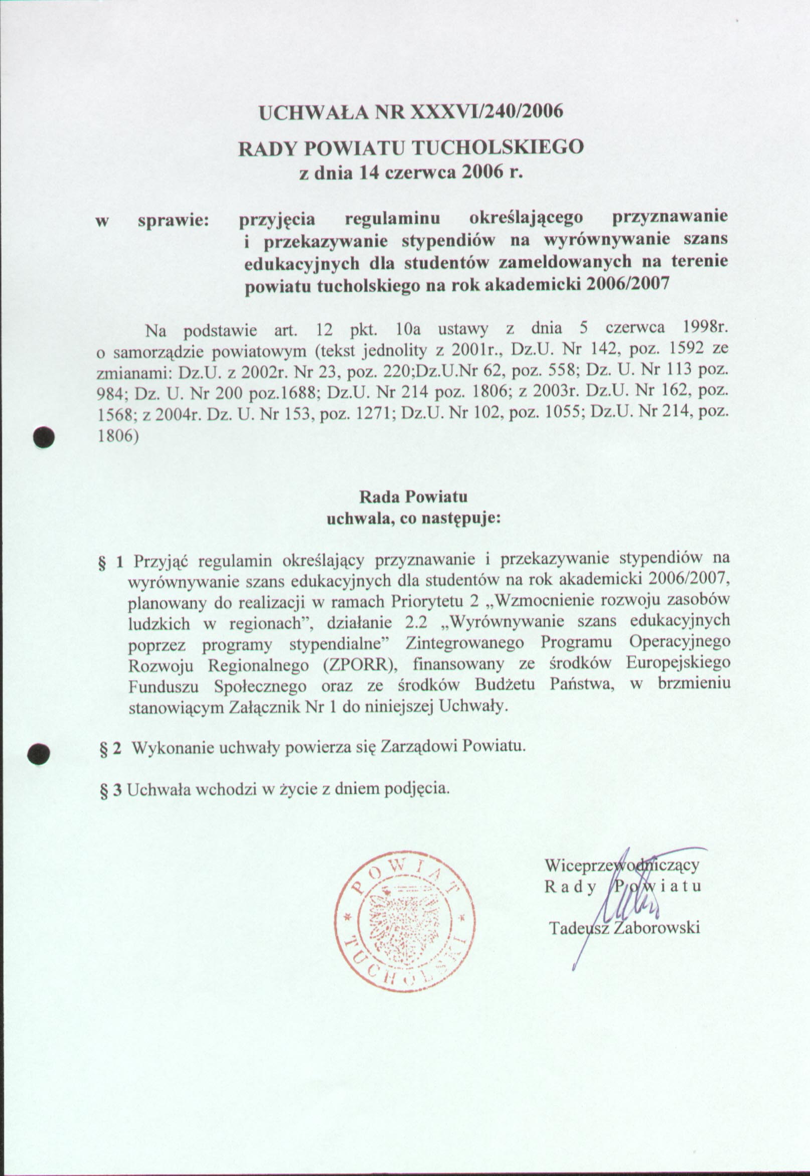 w sprawie przyjęcia regulaminu określającego przyznawanie i przekazywanie stypendiów na wyrównywanie szans edukacyjnych dla studentów zameldowanych na terenie powiatu tucholskiego na rok akademicki 2006/2007