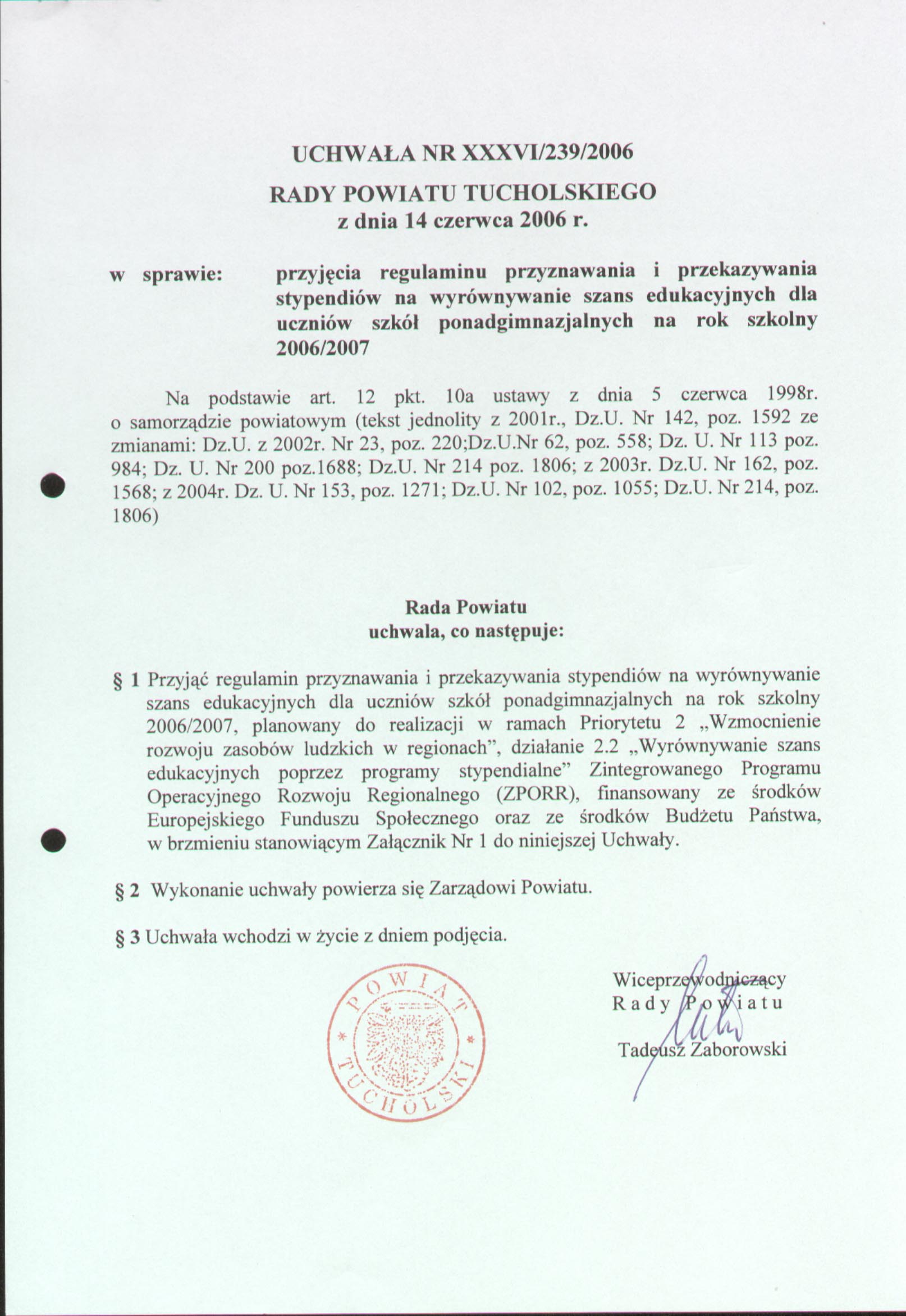 w sprawie przyjęcia regulaminu przyznawania i przekazywania stypendiów na wyrównywanie szans edukacyjnych dla uczniów szkół ponadgimnazjalnych na rok szkolny 2006-2007