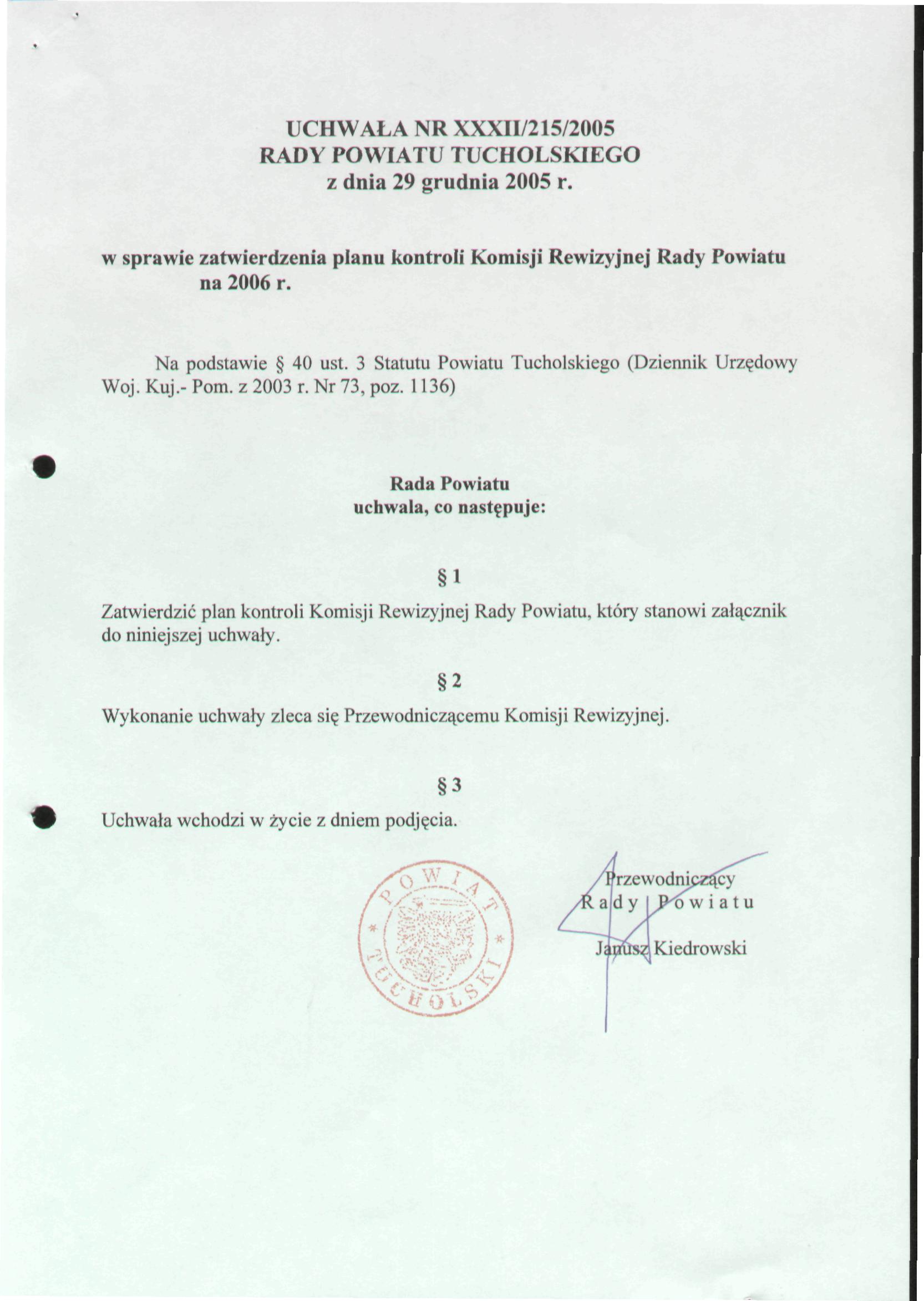 w sprawie zatwierdzenia planu kontroli Komisji Rewizyjnej Rady Powiatu na 2006 rok