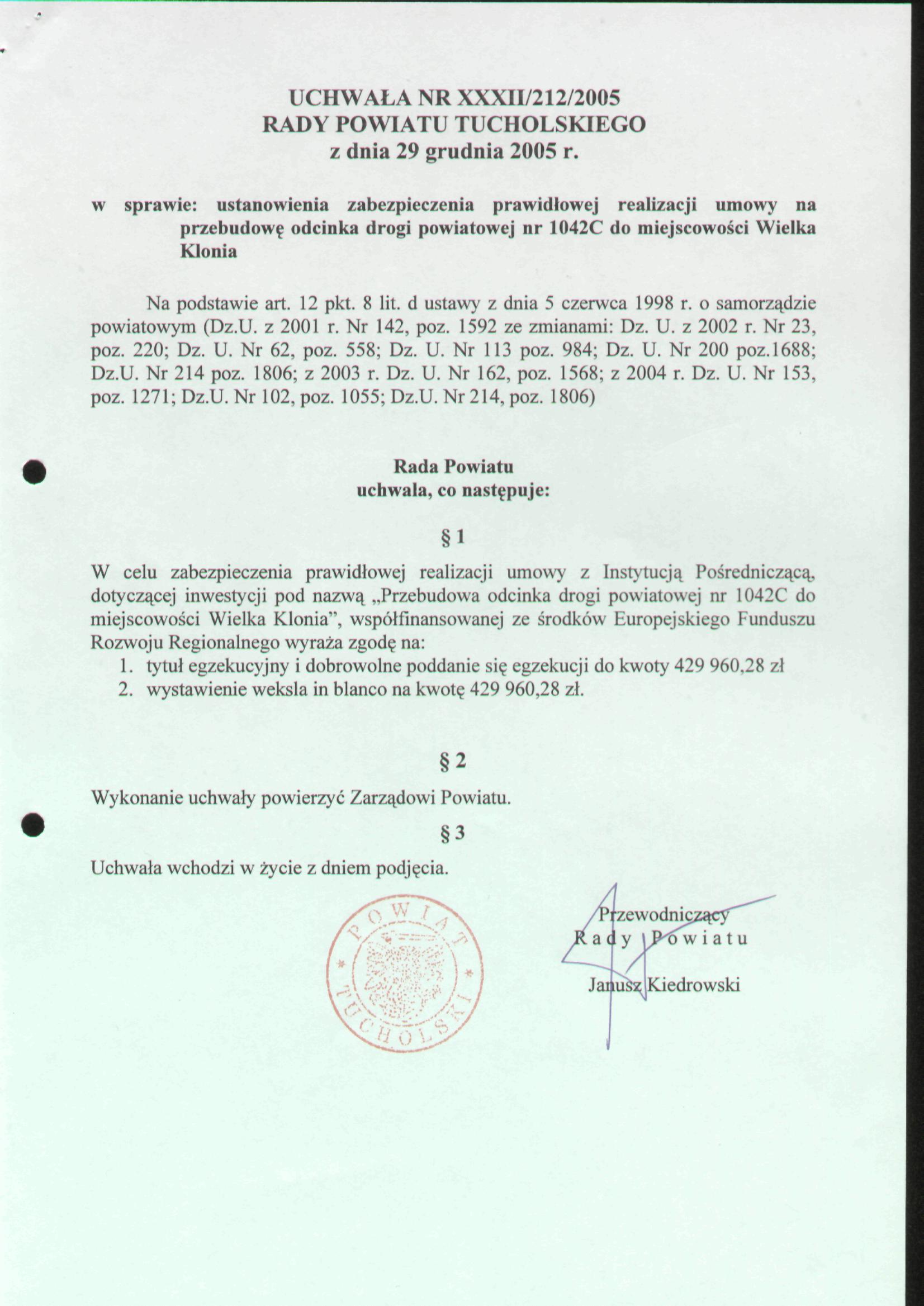 w sprawie ustanowienia zabezpieczenia prawidłowej realizacji umowy na przebudowę odcinka drogi powiatowej nr 1042C do miejscowości Wielka Klonia