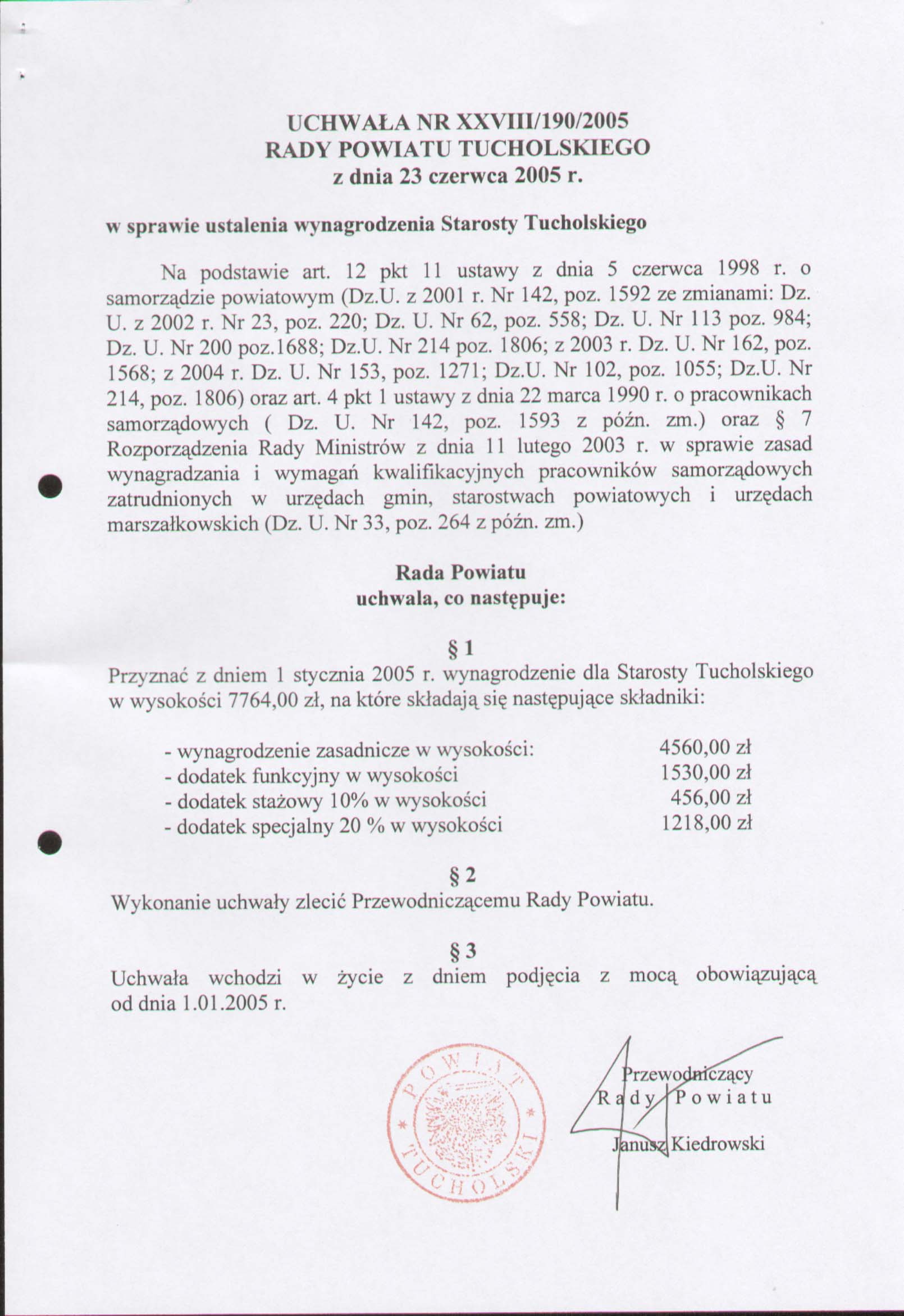 w sprawie ustalenia wynagrodzenia Starosty Tucholskiego