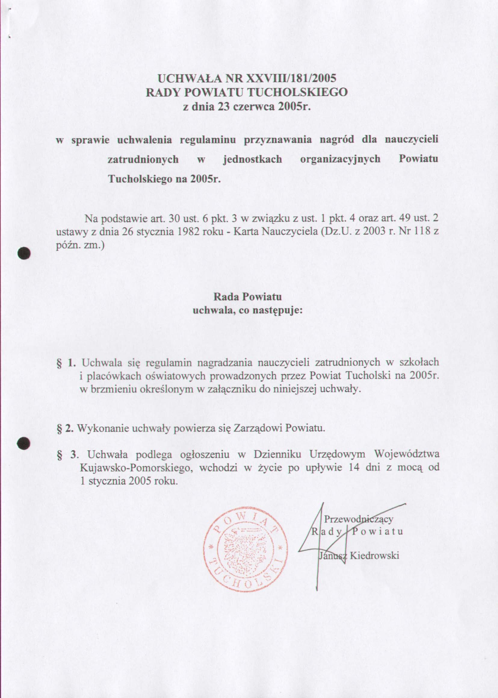 w sprawie uchwalenia regulaminu przyznawania nagród dla nauczycieli zatrudnionych w jednostkach organizacyjnych Powiatu Tucholskiego na 2005 r.