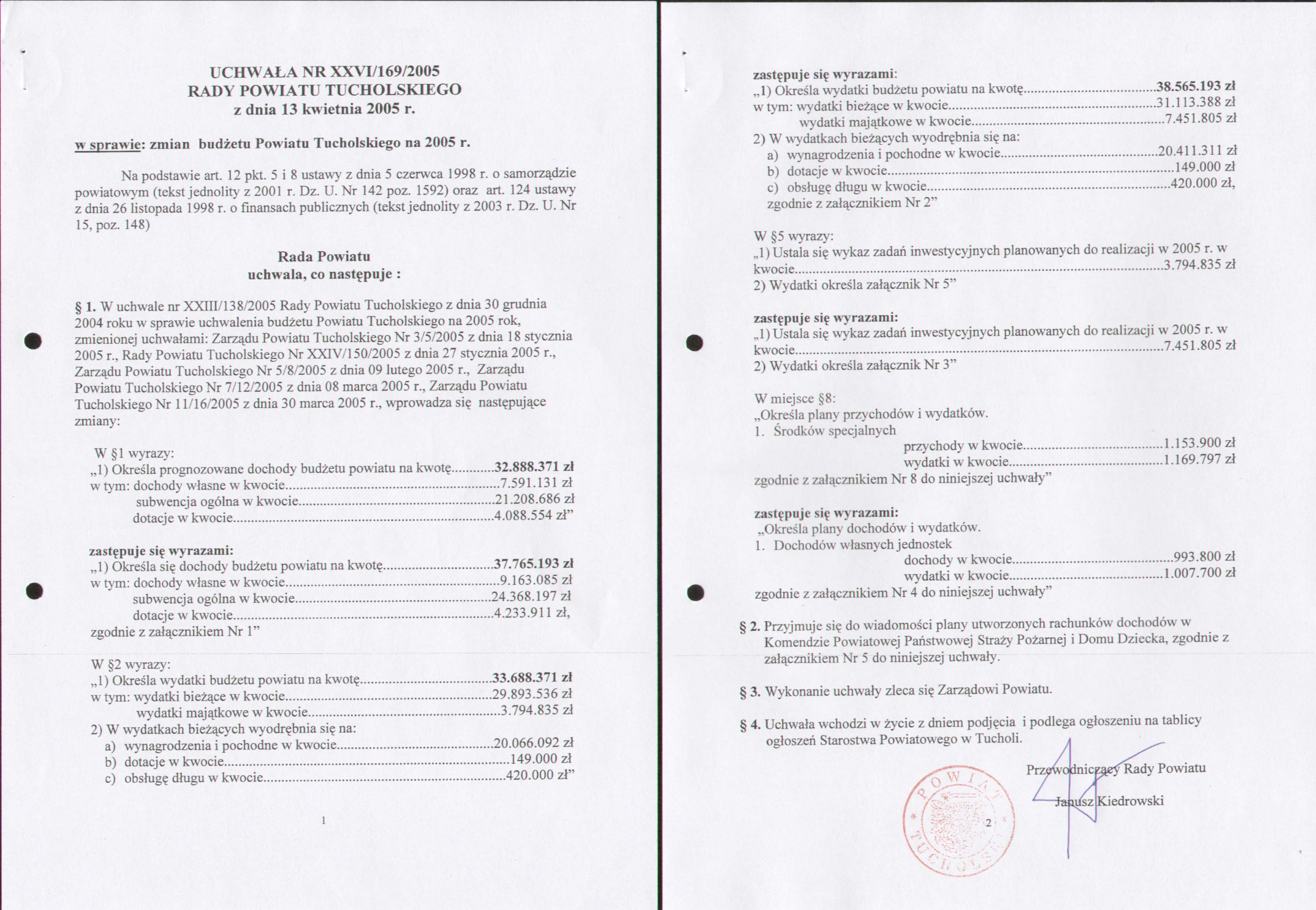 w sprawie zmian budżetu Powiatu Tucholskiego na 2005 r.