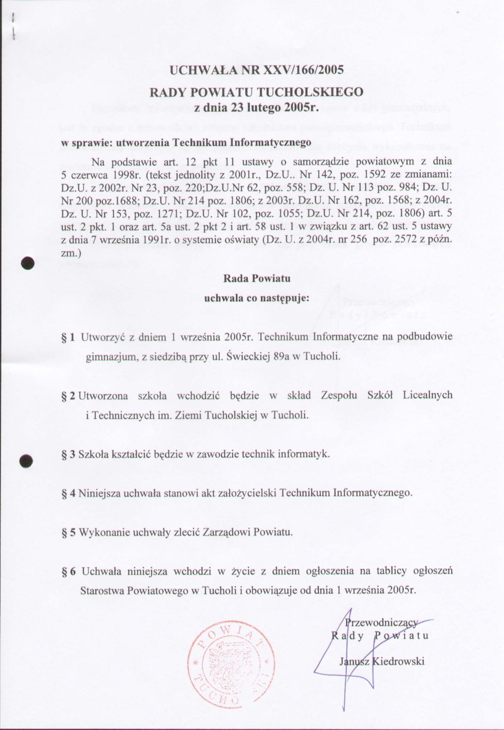 Uchwała nr XXV/166/2005 Rady Powiatu Tucholskiego z dnia 23 lutego 2005