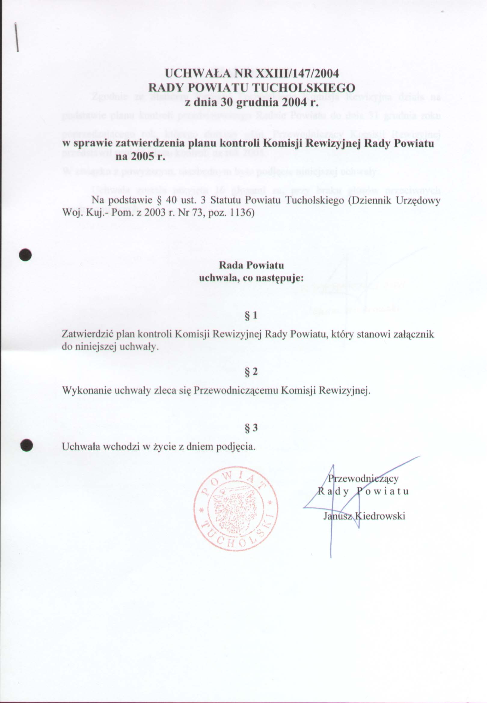 w sprawie zatwierdzenia planu kontroli Komisji Rewizyjnej na 2005 r.