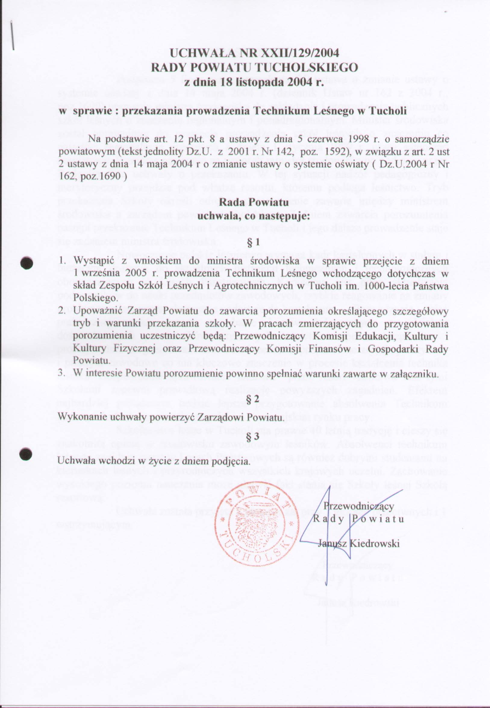 Uchwała nr XXII/129/2004 Rady Powiatu Tucholskiego z dnia 18 listopada 2004
