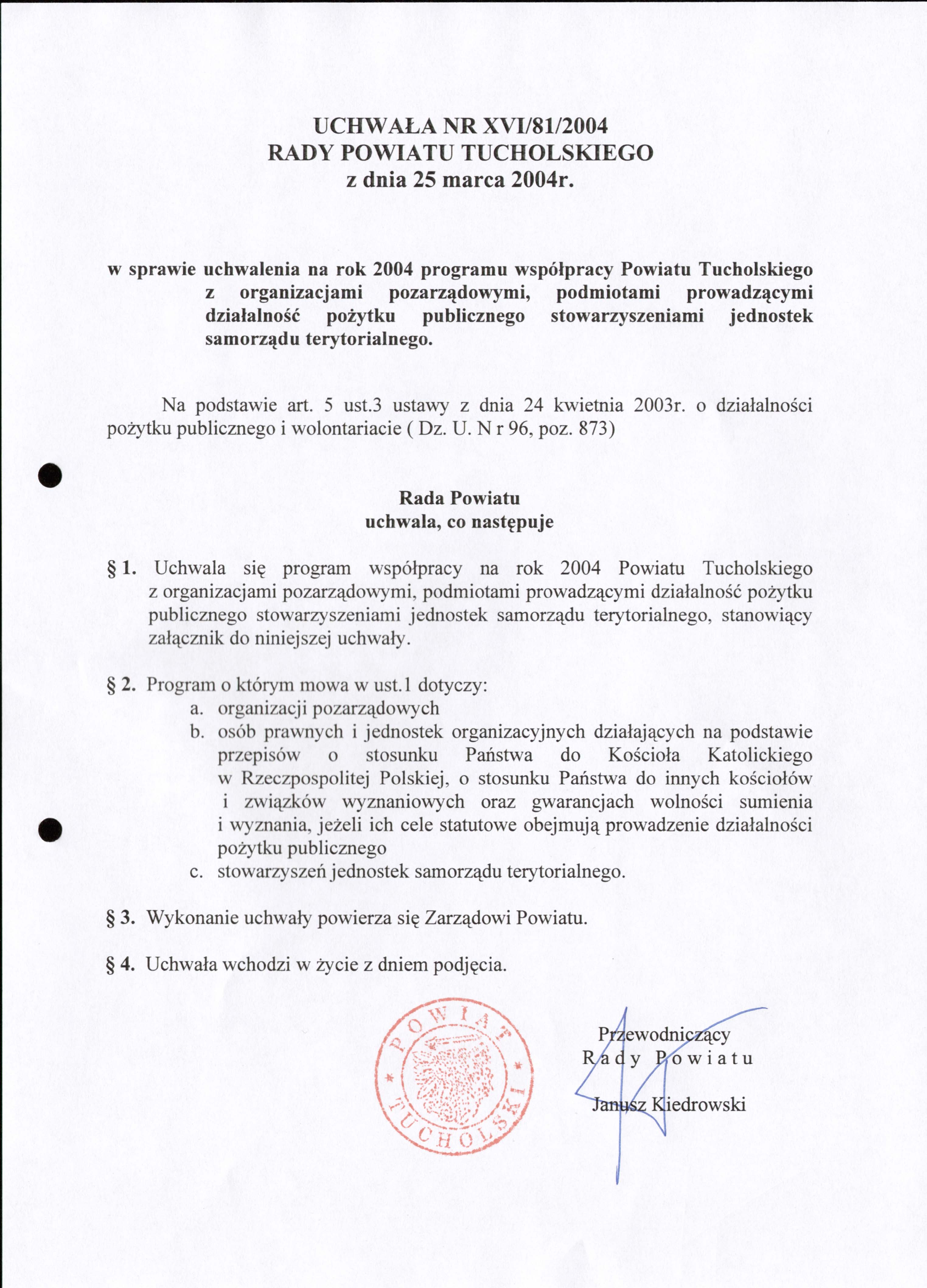 w sprawie uchwalenia na rok 2004 programu współpracy Powiatu Tucholskiego z organizacjami pozarządowymi, podmiotami prowadzącymi działalność pożytku publicznego stowarzyszeniami jednostek samorządu terytorialnego