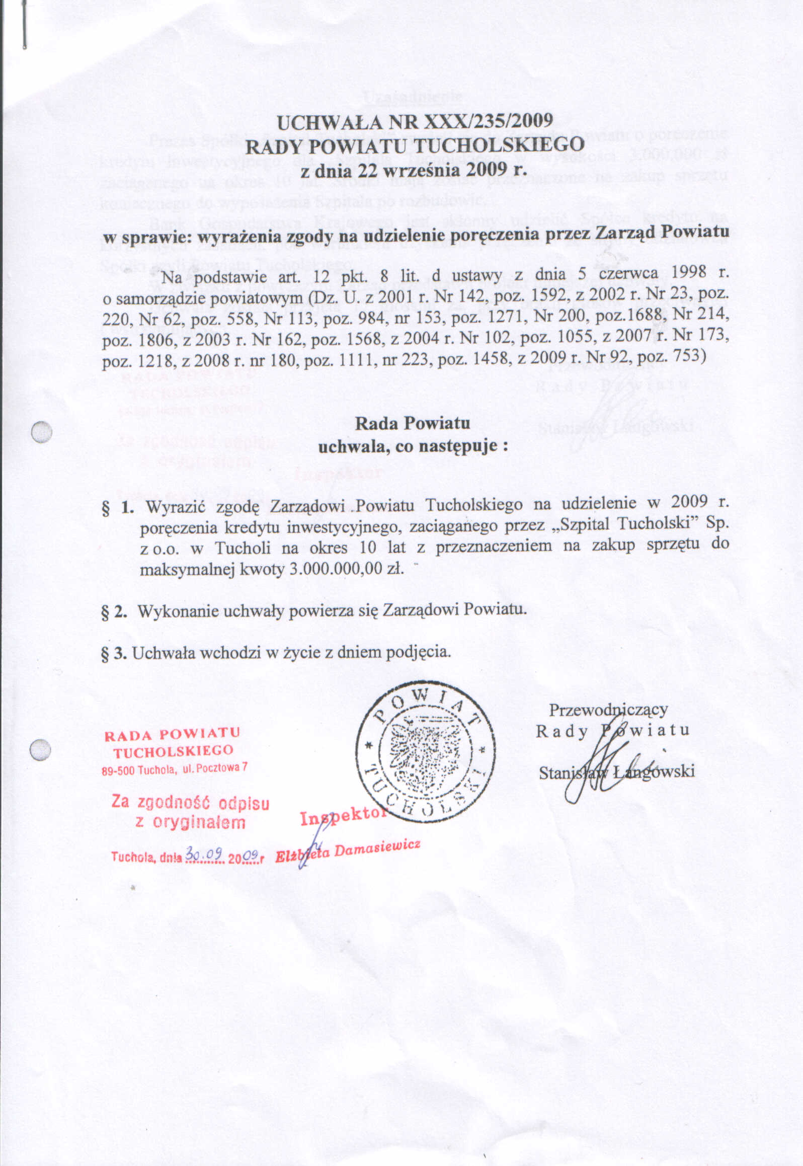 5. Zabezpieczenie kredytu: poręczenie Powiatu Tucholskiego na całość zaciągniętego kredytu.