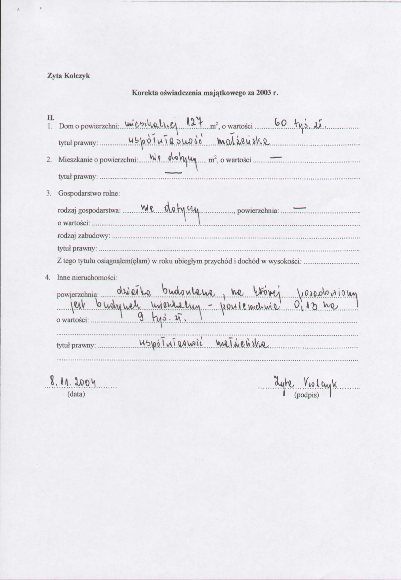 Oświadczenie majątkowe radnej Zyty Kolczyk