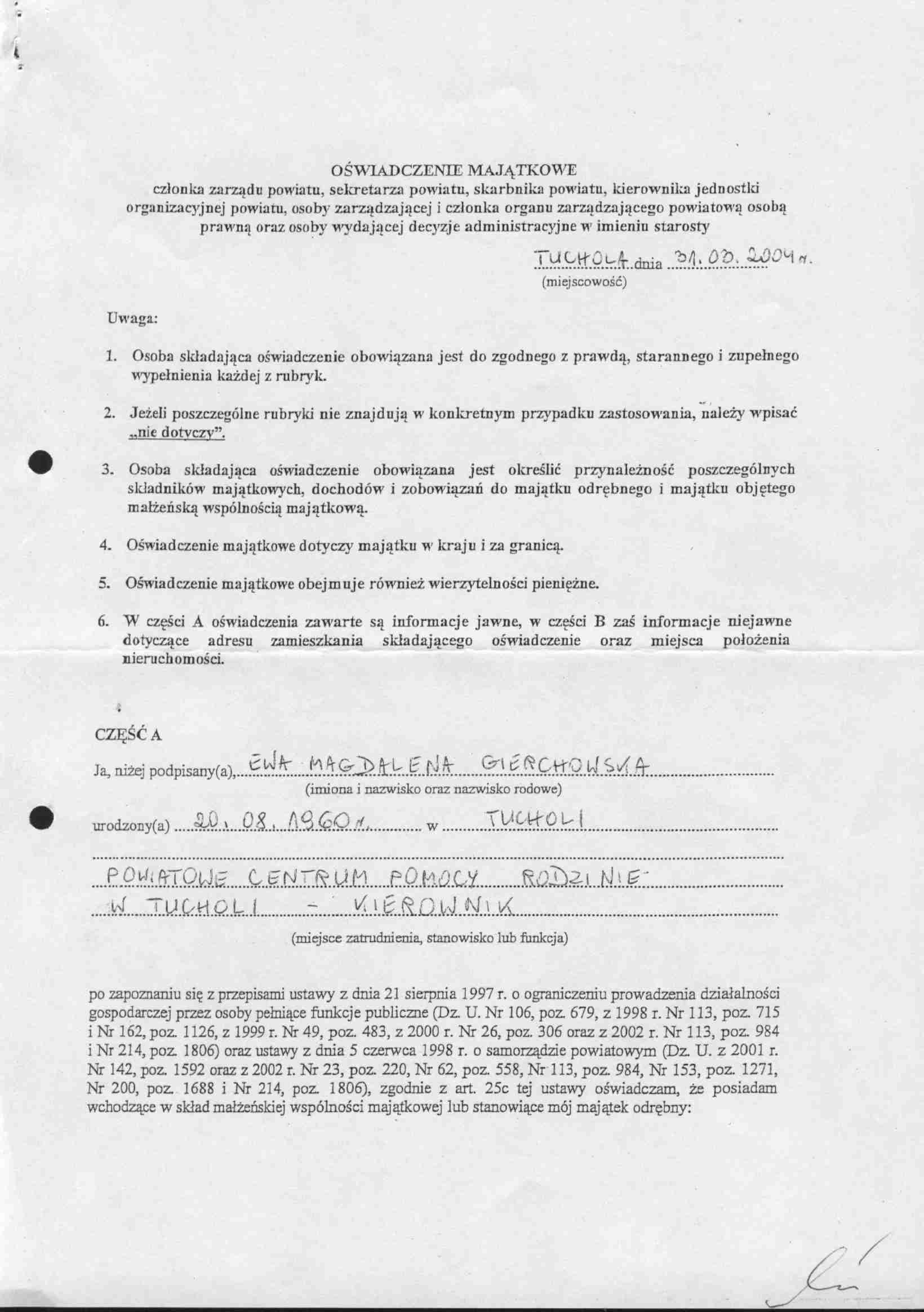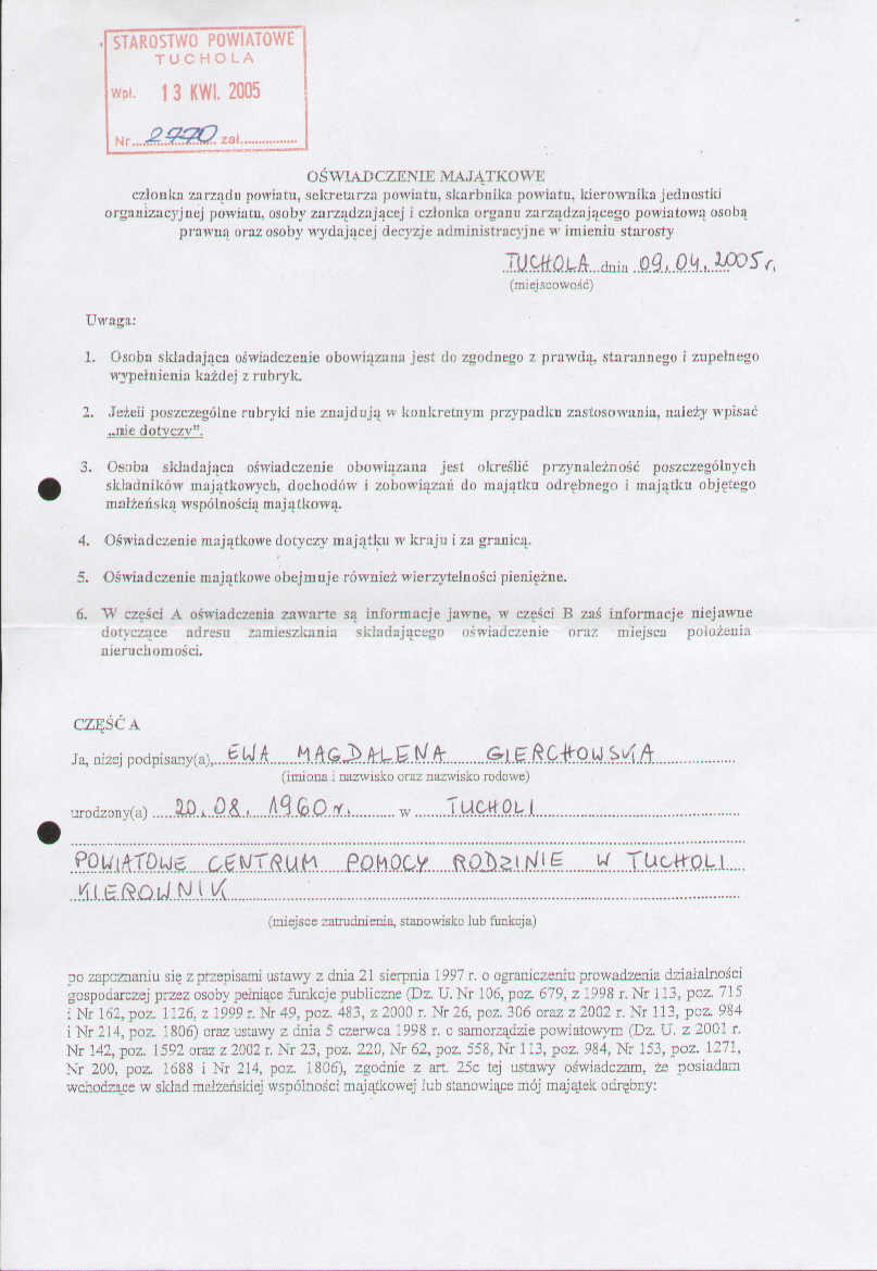 | utworzono: | data: 09:53, 11.05.2005 | przez: Jacek Lorczak | Oświadczenie majątkowe Ewy Gierchowskiej - Kierownik Powiatowego Centrum Pomocy Rodzinie |