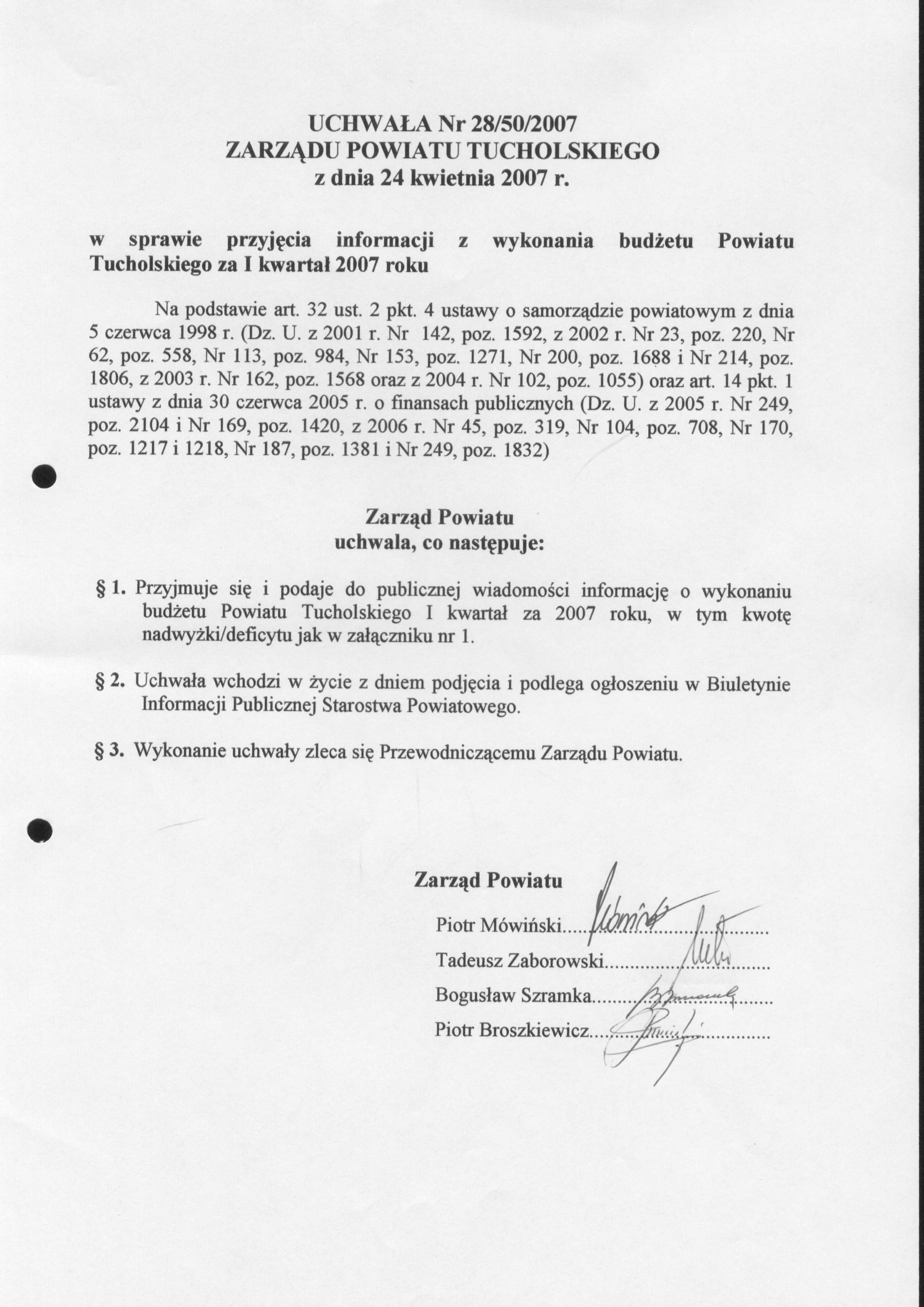 w sprawie przyjęcia informacji z wykonania budżetu Powiatu Tucholskiego za I kwartał 2007 roku