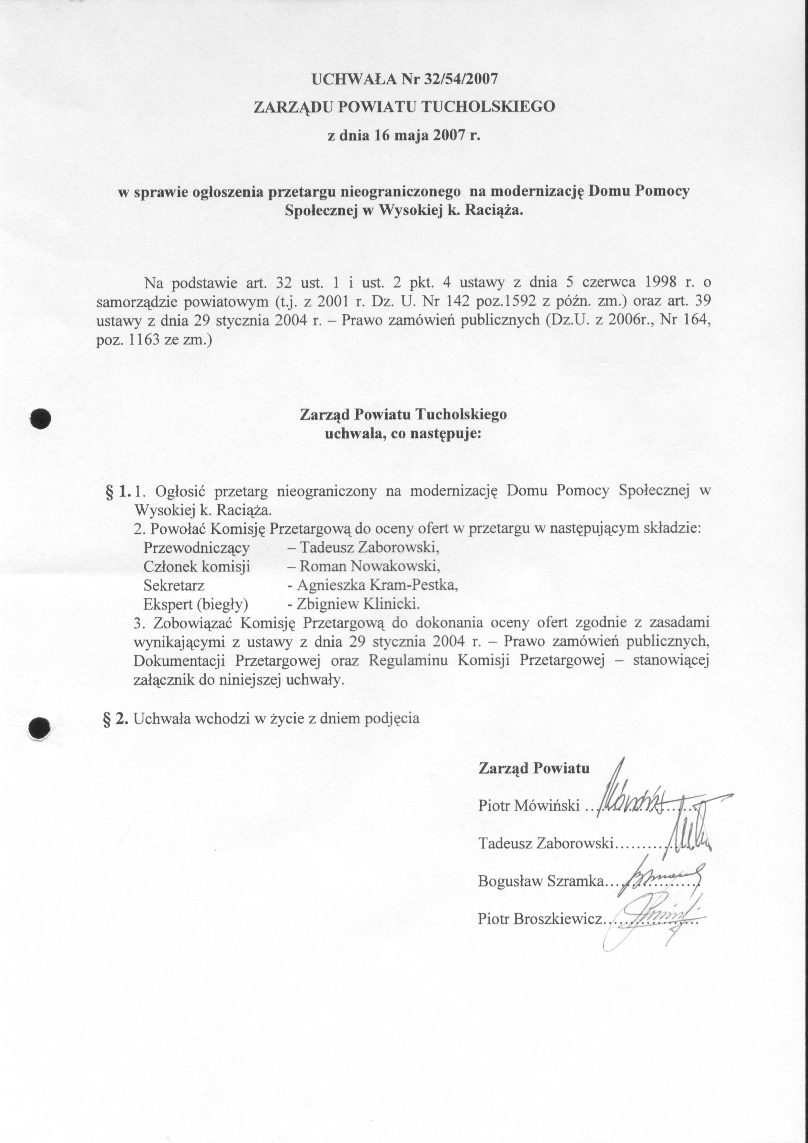 w sprawie ogłoszenia przetargu nieograniczonego na modernizację Domu Pomocy Społecznej w Wysokiej k. Raciąża.