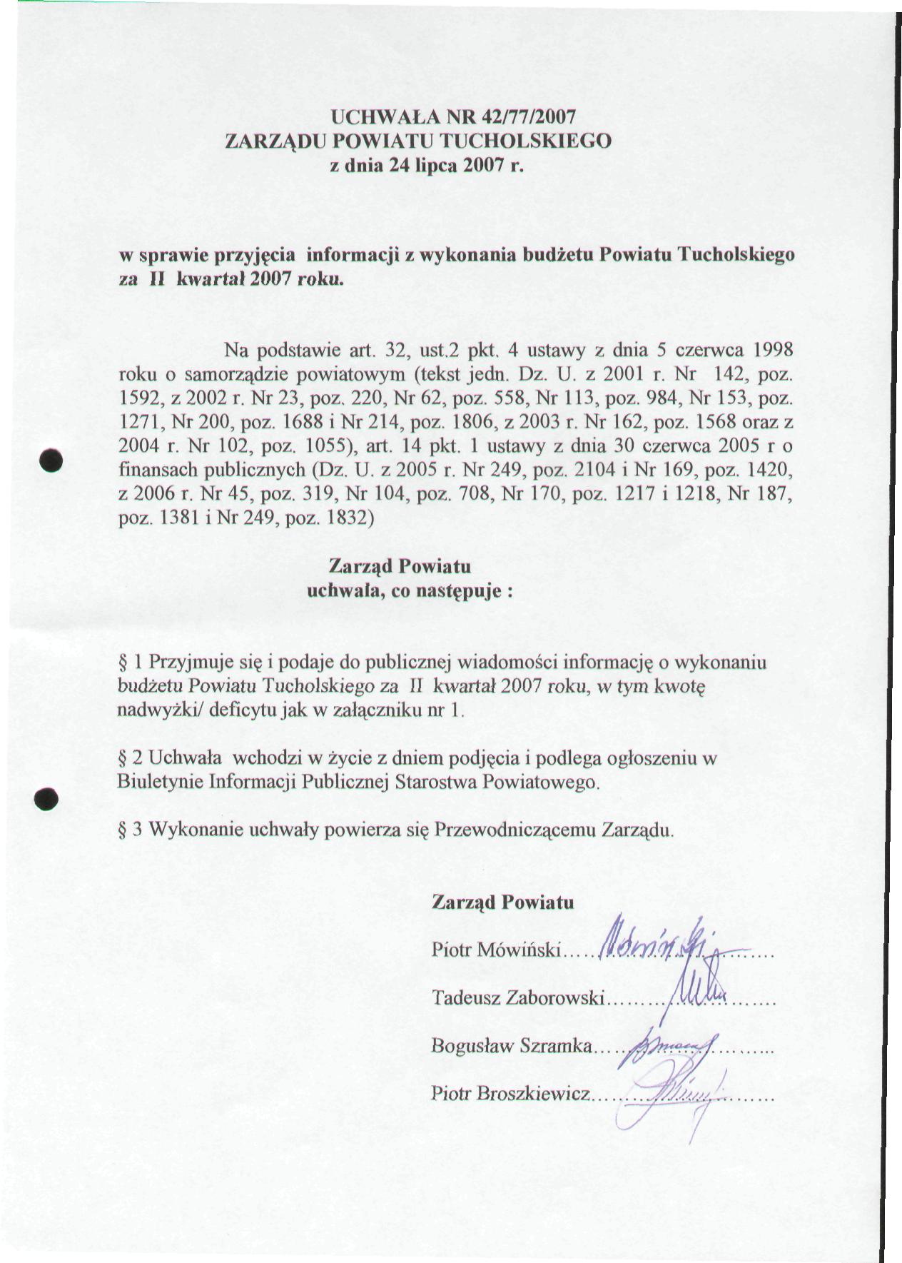 w sprawie przyjęcia informacji z wykonania budżetu Powiatu Tucholskiego za II kwartał 2007 roku.