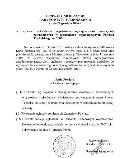 | utworzono: | data: 12:16, 23.02.2010 | przez: Elżbieta Damasiewicz | Uchwała nr III/22/2006 Rady Powiatu Tucholskiego z dnia 29 grudnia 2006 w sprawie uchwalenia regulaminu wynagradzania nauczycieli zatrudnionych w jednostkach organizacyjnych Powiatu Tucholskiego na 2007 r. |