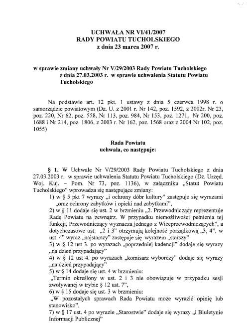 | utworzono: | data: 11:17, 23.02.2010 | przez: Elżbieta Damasiewicz | Uchwała nr VI/41/2007 Rady Powiatu Tucholskiego z dnia 23 marca 2007 w sprawie zmiany uchwały Nr V/29/2003 Rady Powiatu Tucholskiego z dnia 27.03.2003 r. w sprawie uchwalenia Statutu Powiatu Tucholskiego |