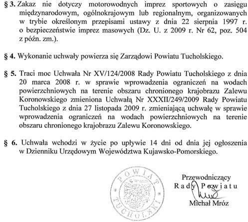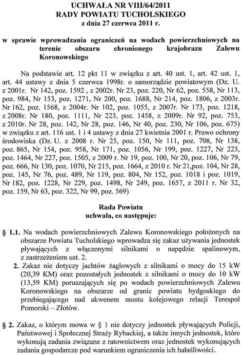 Uchwała nr VIII/64/2011 Rady Powiatu Tucholskiego z dnia 27 czerwca 2011 r. w sprawie wprowadzania ograniczeń na wodach powierzchniowych na terenie obszaru chronionego krajobrazu Zalewu Koronowskiego