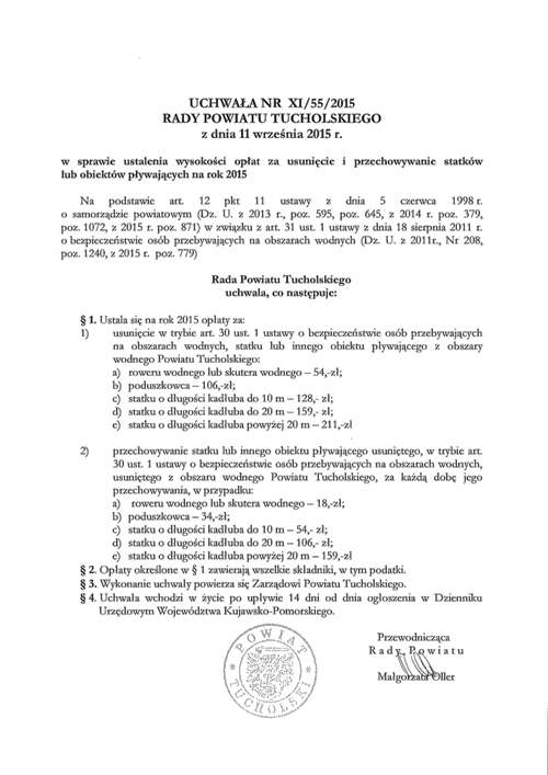 Uchwała Nr XI/55/2015 Rady Powiatu Tucholskiego z dnia 11 września 2015 r. w sprawie ustalenia wysokości opłat za usunięcie i przechowywanie statków lub obiektów pływających na rok 2015