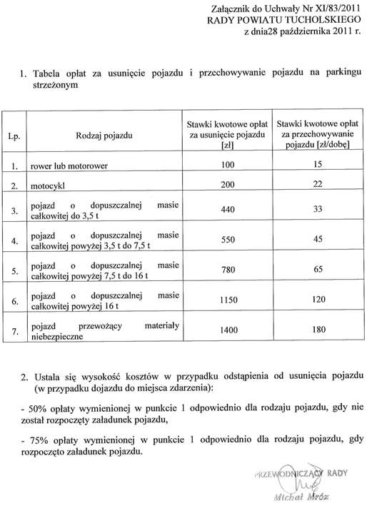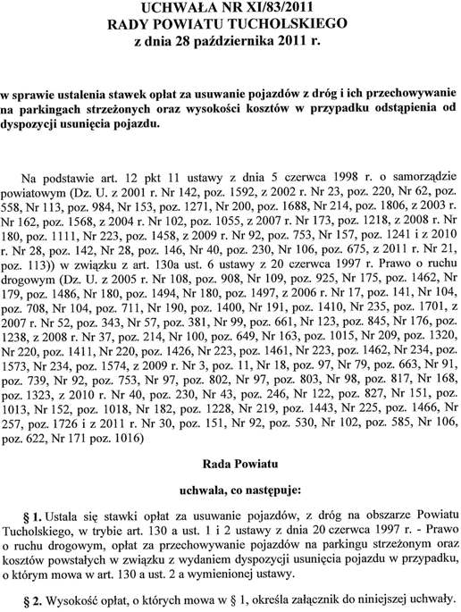 | utworzono: | data: 10:33, 30.11.2011 | przez: Elżbieta Damasiewicz | Uchwała Nr XI/83/2011 Rady Powiatu Tucholskiego z dnia 28 października 2011 r. w sprawie ustalenia stawek opłat za usuwanie pojazdów z dróg i ich przechowywanie na parkingach strzeżonych... |