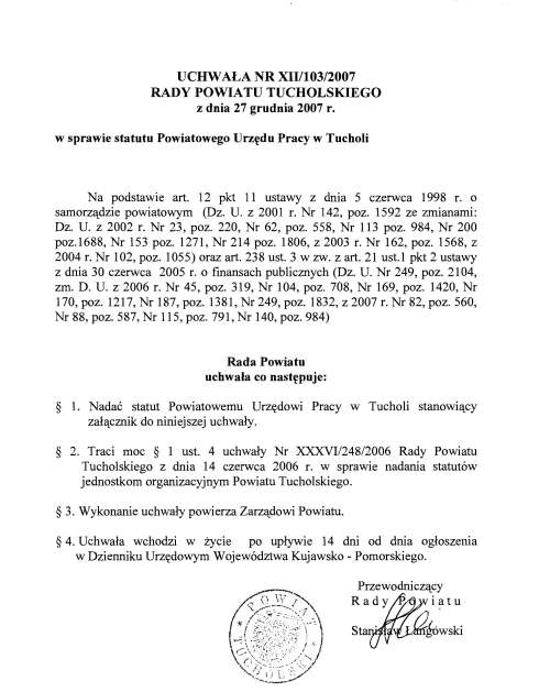 | utworzono: | data: 11:01, 23.02.2010 | przez: Elżbieta Damasiewicz | Uchwała nr XII/103/2007 Rady Powiatu Tucholskiego z dnia 27 grudnia 2007 w sprawie Statutu Powiatowego Urzędu Pracy w Tucholi |