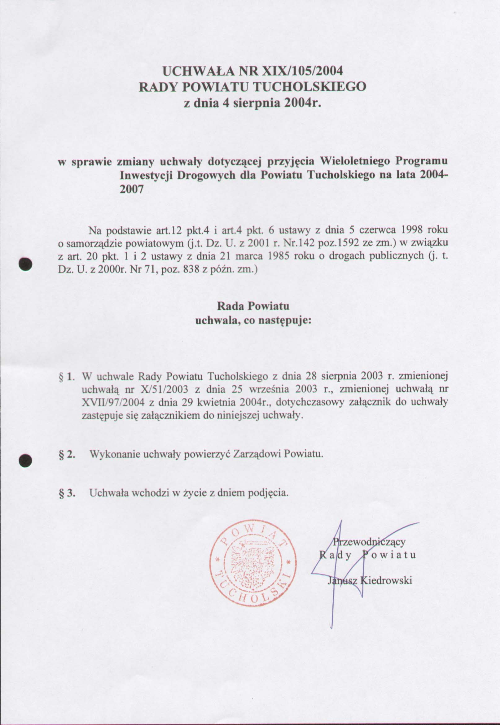 w sprawie zmiany uchwały dotyczącej przyjęcia Wieloletniego Programu Inwestycji Drogowych dla Powiatu Tucholskiego na lata 2004-2007