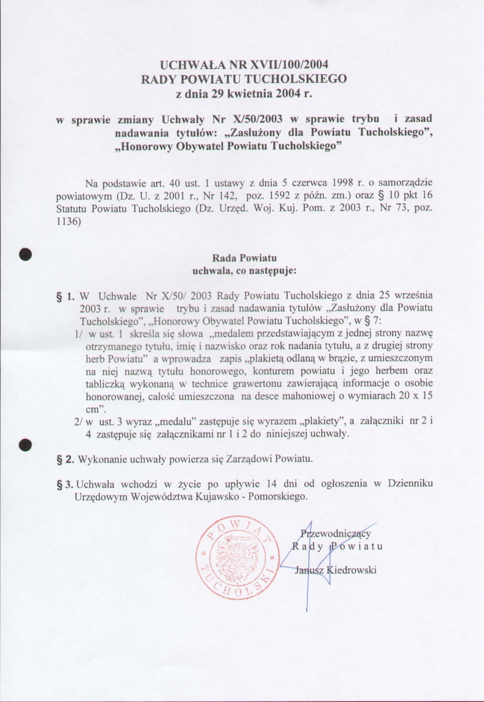 Uchwała nr XVII/100/2004 Rady Powiatu Tucholskiego z dnia 29 kwietnia 2004