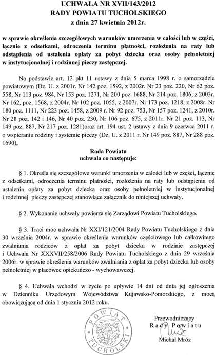 | utworzono: | data: 08:34, 03.08.2012 | przez: Elżbieta Damasiewicz | Uchwała nr XVII/143/2012 Rady Powiatu Tucholskiego z dnia 27 kwietnia 2012 w sprawie określenia szczegółowych warunków umorzenia w całości lub w części, łącznie z odsetkami, odroczenia terminu płatności, rozłożenia na raty... |
