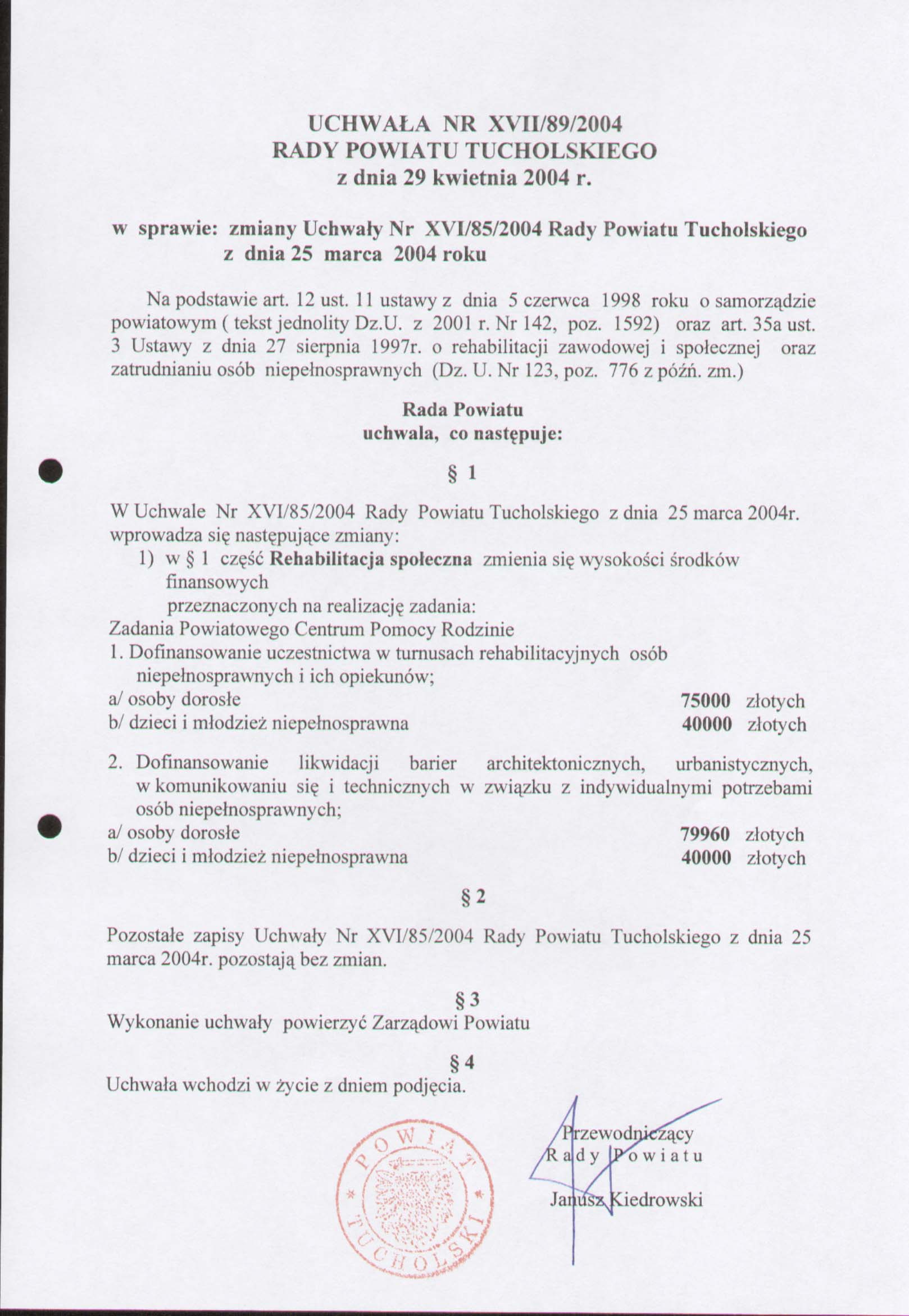 w sprawie zmiany Uchwały Nr XVI/85/2004 Rady Powiatu Tucholskiego z dnia 25 marca 2004 r.