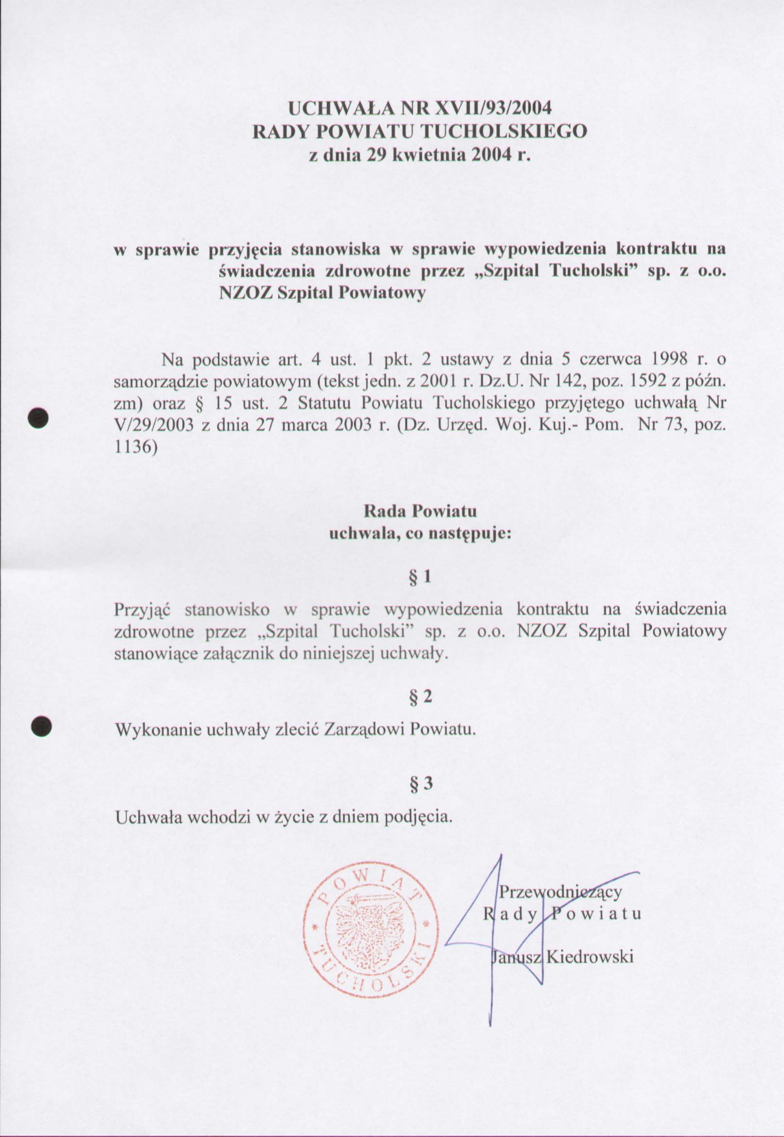 w sprawie przyjęcia stanowiska w sprawie wypowiedzenia kontraktu na świadczenia zdrowotne przez „Szpital Tucholski” Sp. z o.o NZOZ Szpital Powiatowy