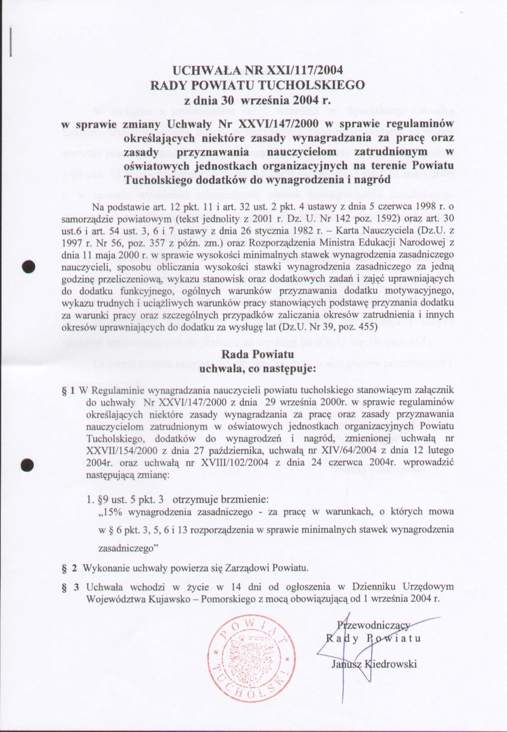w sprawie zmiany uchwały Nr XXVI/147/2000 w sprawie regulaminów określających niektóre zasady wynagradzania za pracę oraz zasady przyznawania nauczycielom zatrudnionym w oświatowych jednostkach organizacyjnych na terenie Powiatu Tucholskiego dodatków do wynagrodzenia i nagród