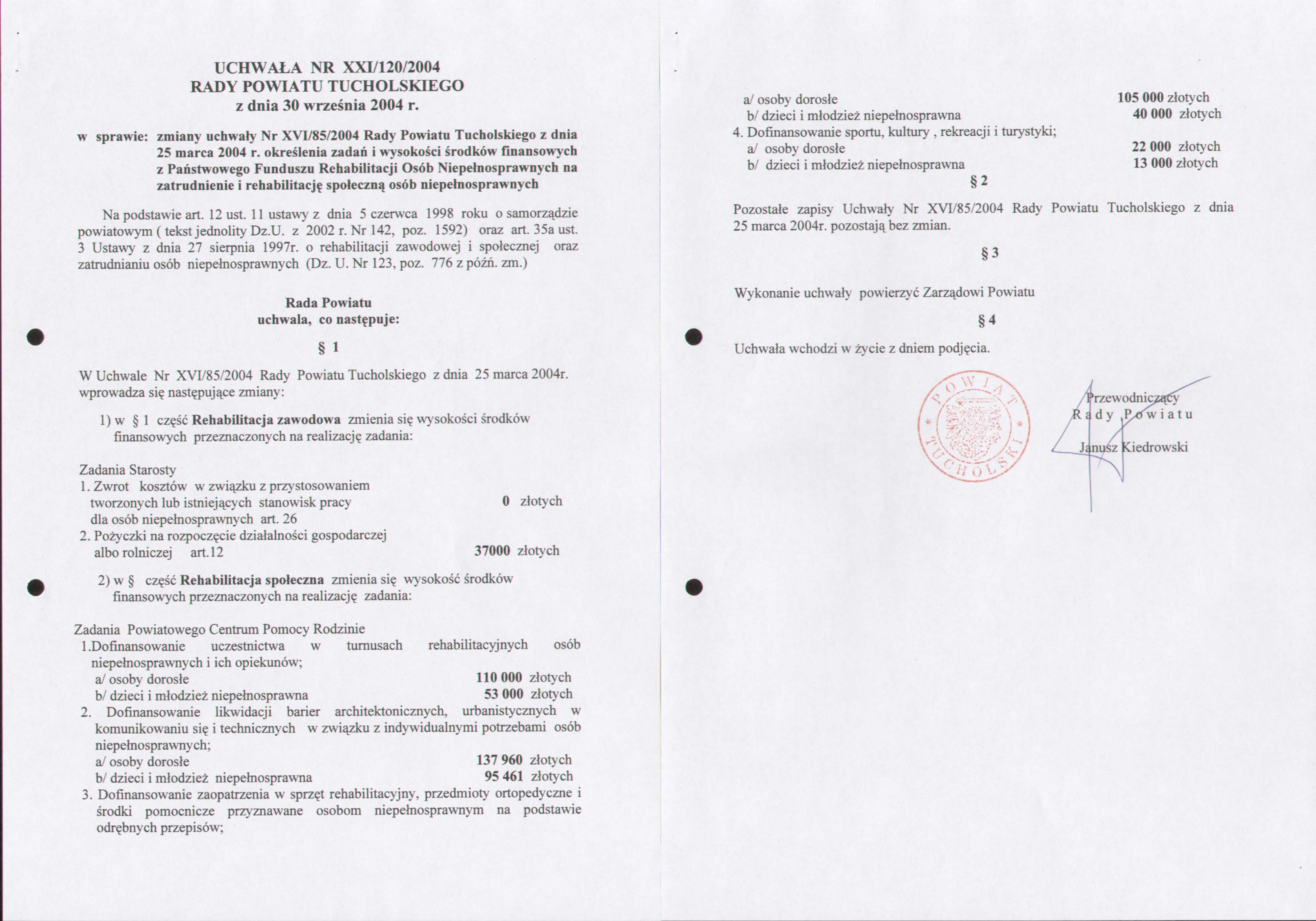 w sprawie zmiany uchwały Nr XVI/85/2004 Rady Powiatu Tucholskiego z dnia 25 marca 2004 r. w sprawie określenia zadań i wysokości środków finansowych z Państwowego Funduszu Rehabilitacji Osób Niepełnosprawnych na zatrudnienie i rehabilitację społeczną osób niepełnosprawnych
