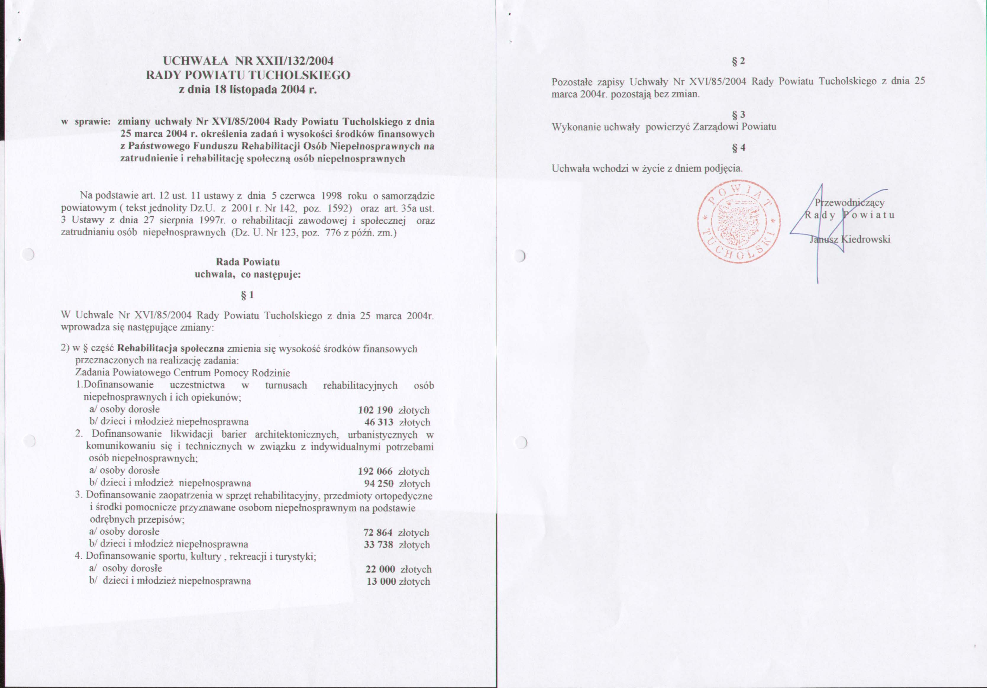 w sprawie zmiany uchwały Nr XVI/85/2004 Rady Powiatu Tucholskiego z dnia 25 marca 2004 r. w sprawie określenia zadań i wysokości środków finansowych z Państwowego Funduszu Rehabilitacji Osób Niepełnosprawnych na zatrudnienie i rehabilitację społeczną osób niepełnosprawnych