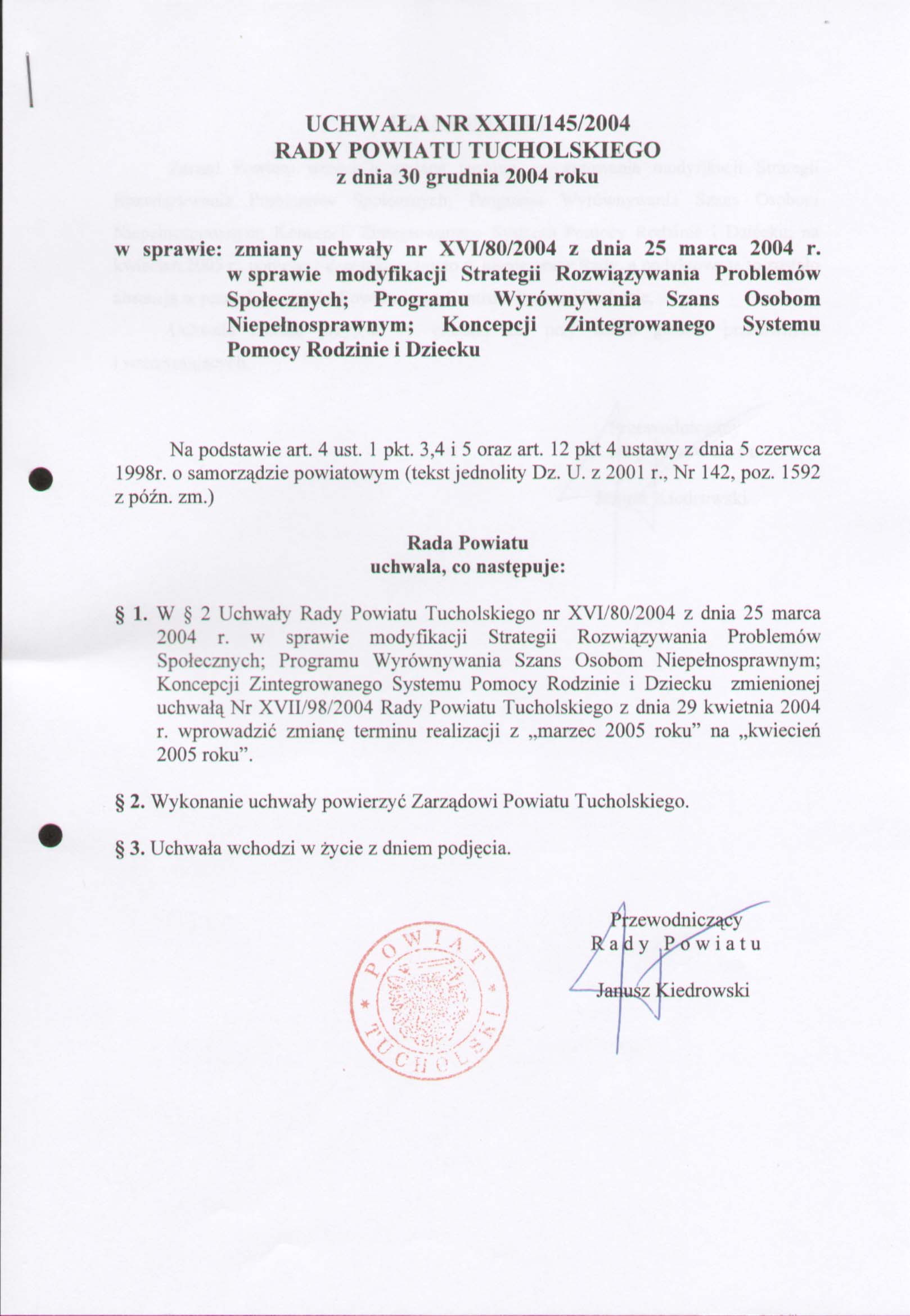 Uchwała nr XXIII/145/2004 Rady Powiatu Tucholskiego z dnia 30 grudnia 2004