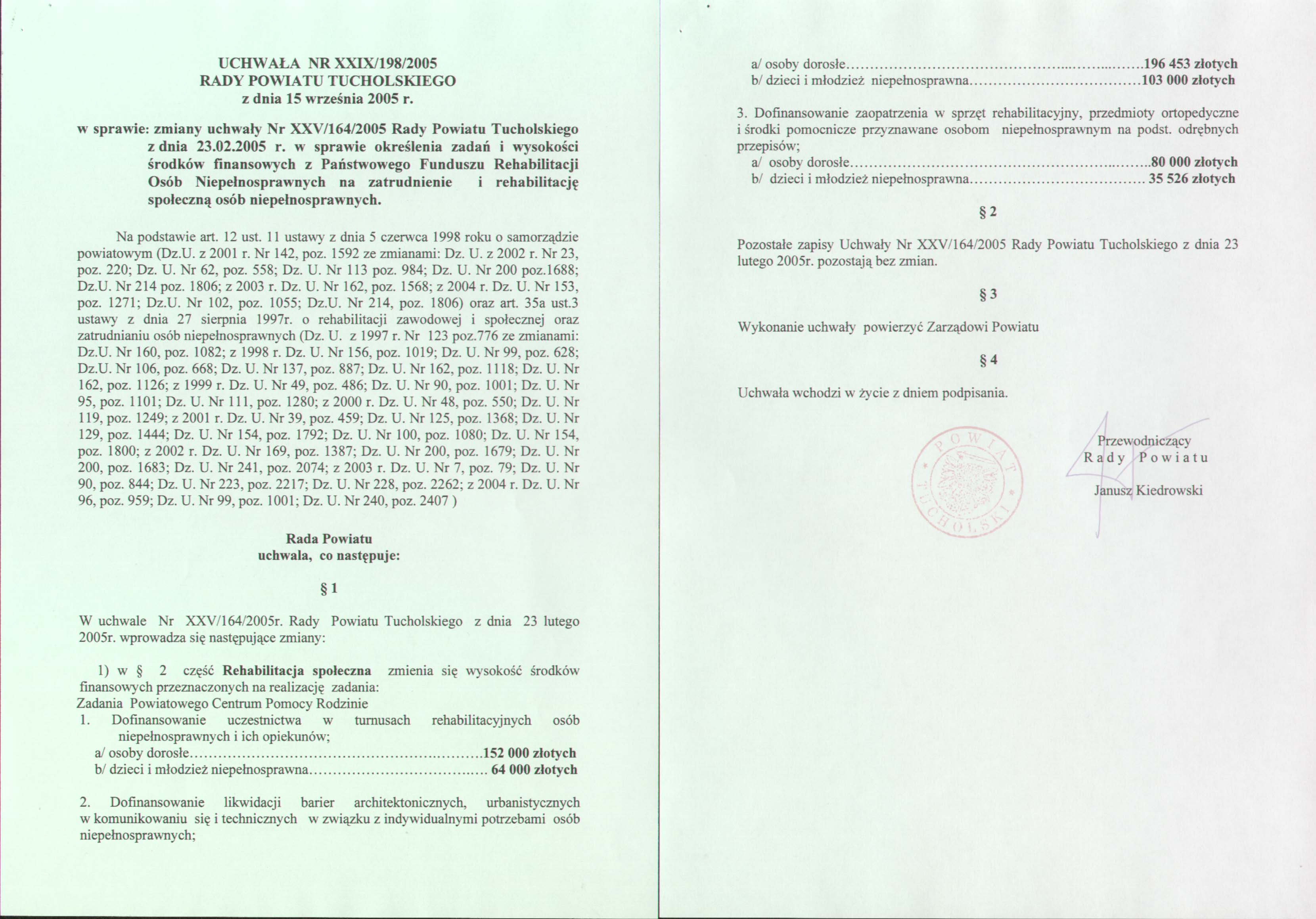 w sprawie zmiany uchwały nr XXV/164/2005 Rady Powiatu Tucholskiego z dnia 23.02.2005 r. w sprawie określenia zadań i wysokości środków finansowych z Państwowego Funduszu Rehabilitacji Osób Niepełnosprawnych na zatrudnienie i rehabilitację społeczną osób niepełnosprawnych