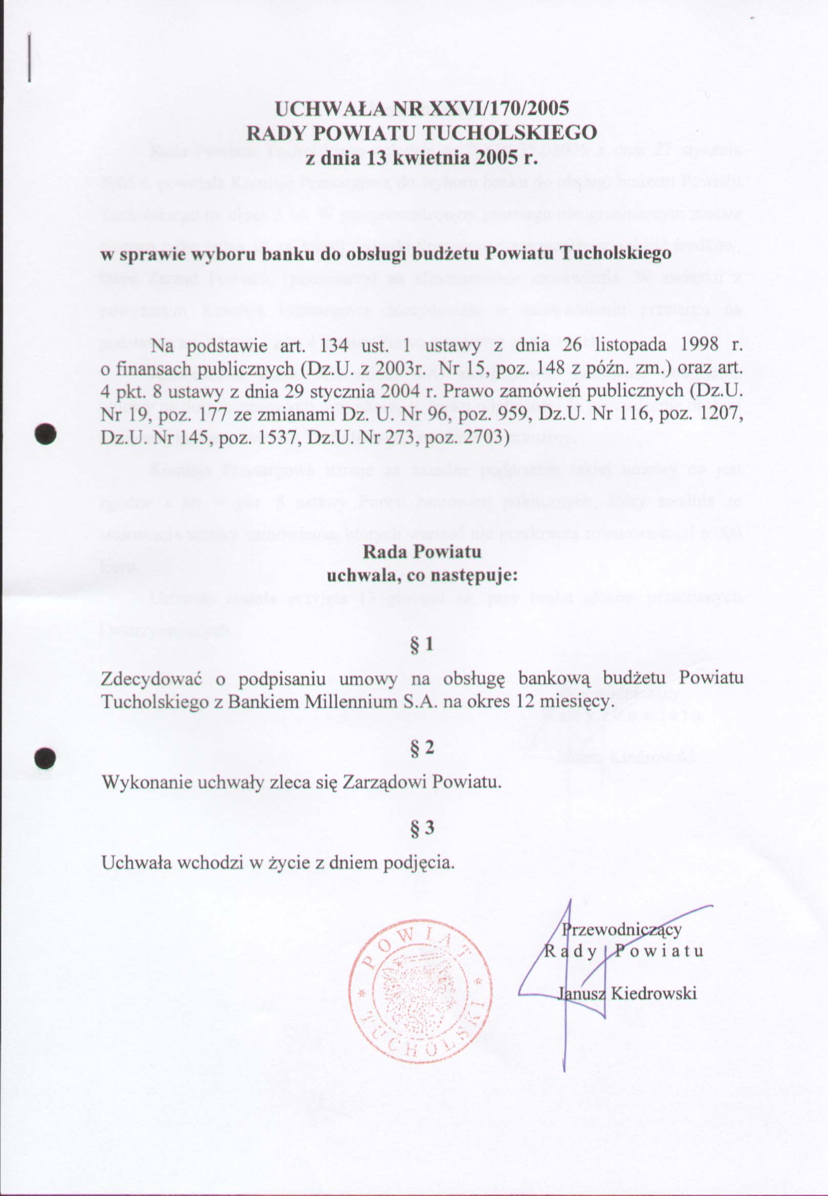 w sprawie wyboru banku do obsługi budżetu Powiatu Tucholskiego