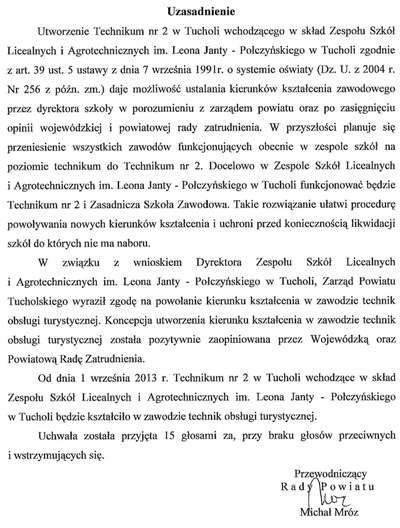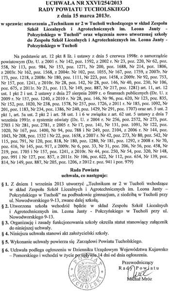 | utworzono: | data: 13:43, 24.05.2013 | przez: Elżbieta Damasiewicz | Uchwała Nr XXVI/254/2013 Rady Powiatu z dnia 15.03.2013 r. w sprawie utworzenia „Technikum nr 2 w Tucholi wchodzącego w skład ZSLiA im. Leona Janty - Połczyńskiego w Tucholi” oraz włączenia nowo utworzonej szkoły do ZSLiA... |