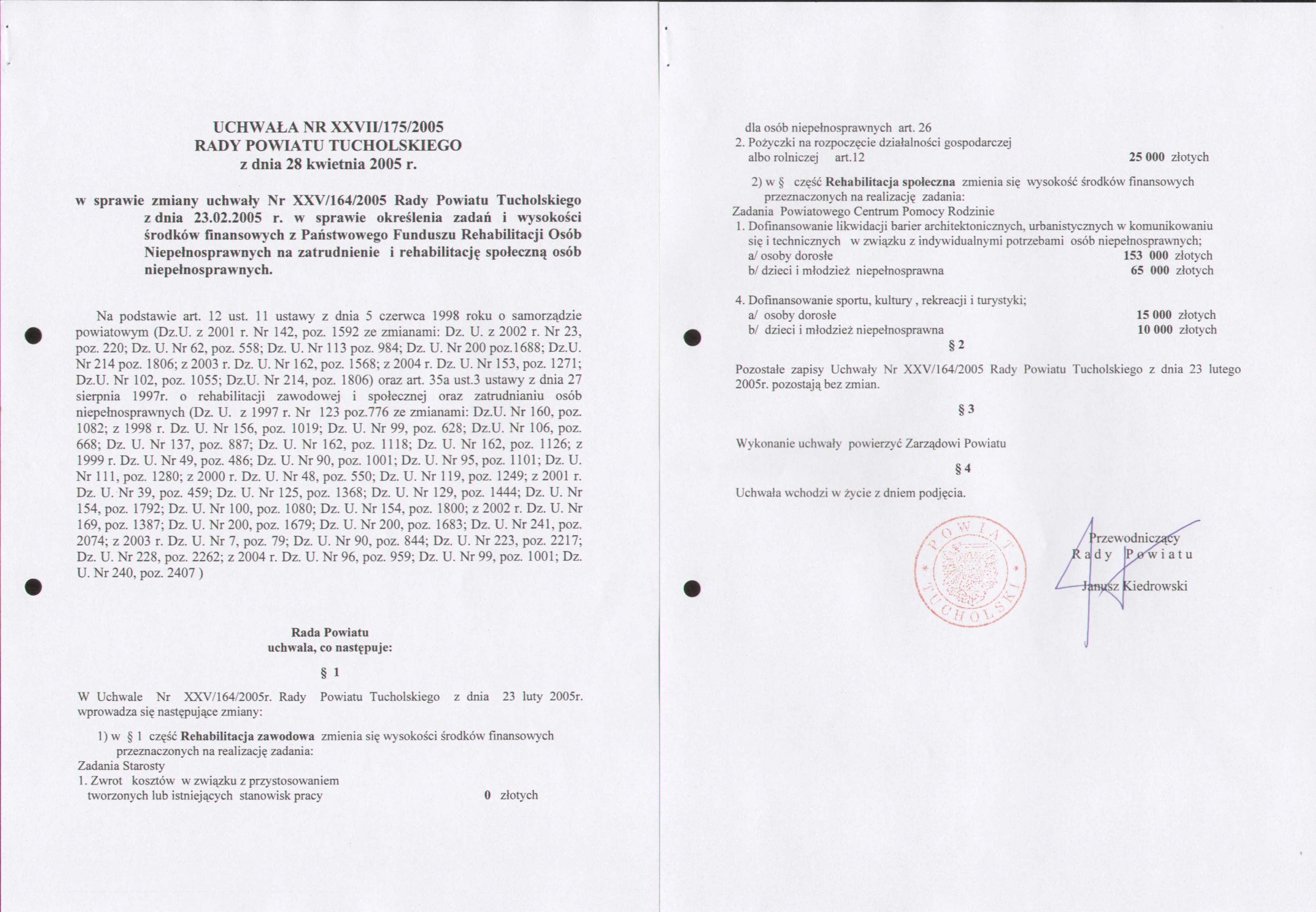 w sprawie zmiany uchwały Nr XXV/164/2005 Rady Powiatu Tucholskiego z dnia 23.02.2005 r. w sprawie określenia zadań i wysokości środków z Państwowego Funduszu Rehabilitacji Osób Niepełnosprawnych na zatrudnienie i rehabilitację społeczną osób niepełnosprawnych