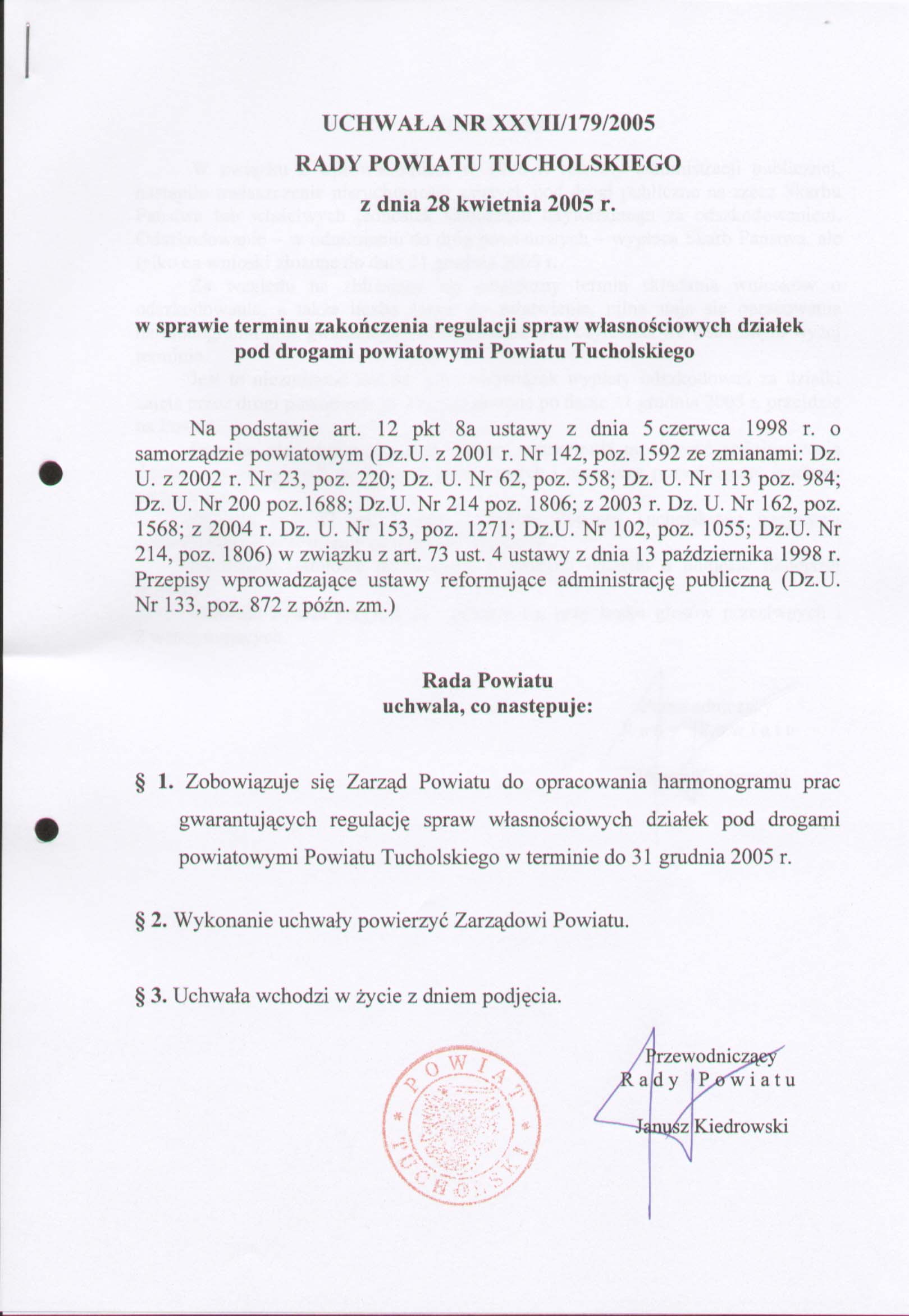 w sprawie terminu zakończenia regulacji spraw własnościowych działek pod drogami powiatowymi Powiatu Tucholskiego
