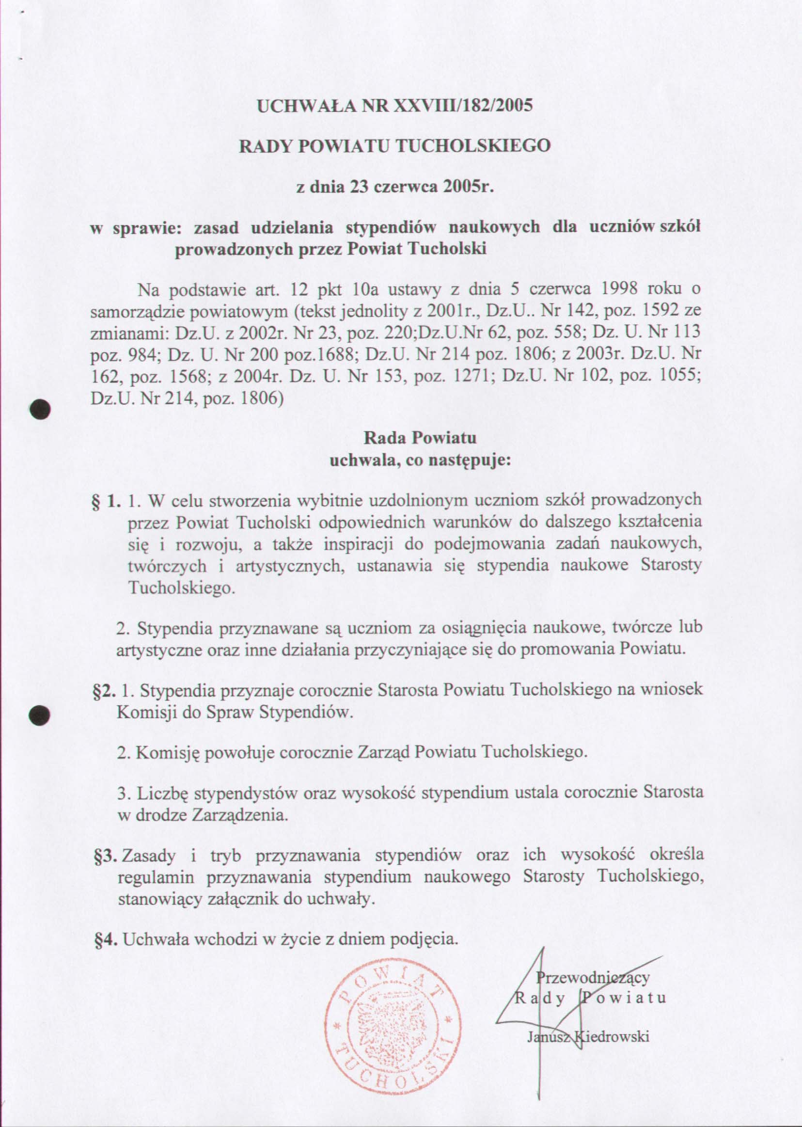 w sprawie udzielania stypendiów naukowych dla uczniów szkół prowadzonych przez Powiat Tucholski