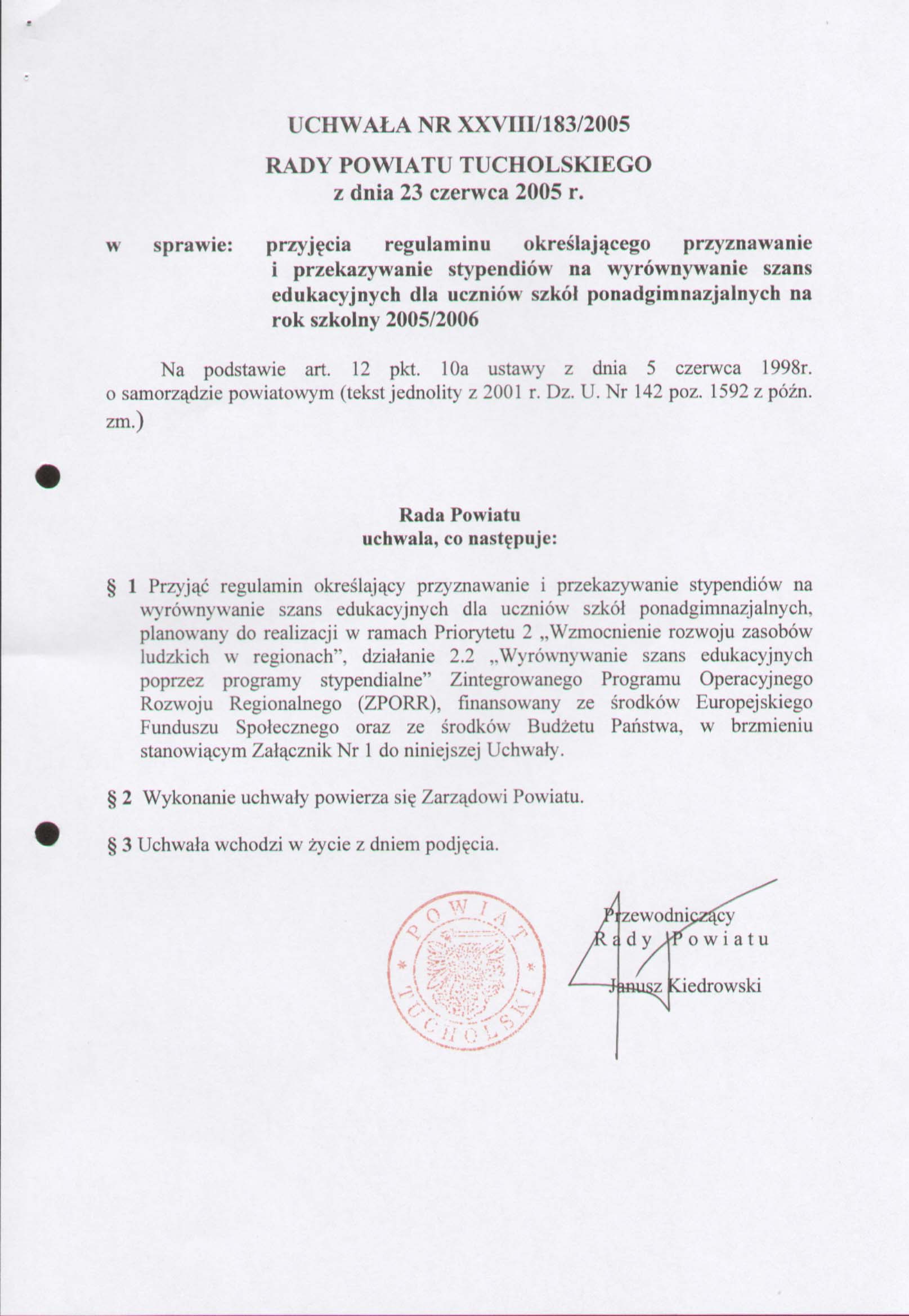 Uchwała nr XXVIII/183/2005 Rady Powiatu Tucholskiego z dnia 23 czerwca 2005