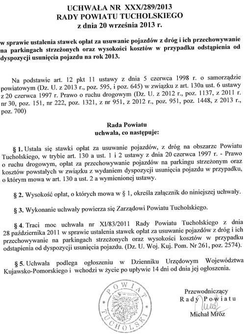| utworzono: | data: 10:27, 03.03.2014 | przez: Elżbieta Damasiewicz | Uchwała nr XXX/289/2013 Rady Powiatu Tucholskiego z dnia 20 września 2013 r. w sprawie ustalenia stawek opłat za usuwanie pojazdów z dróg i ich przechowywanie na parkingach strzeżonych ... |