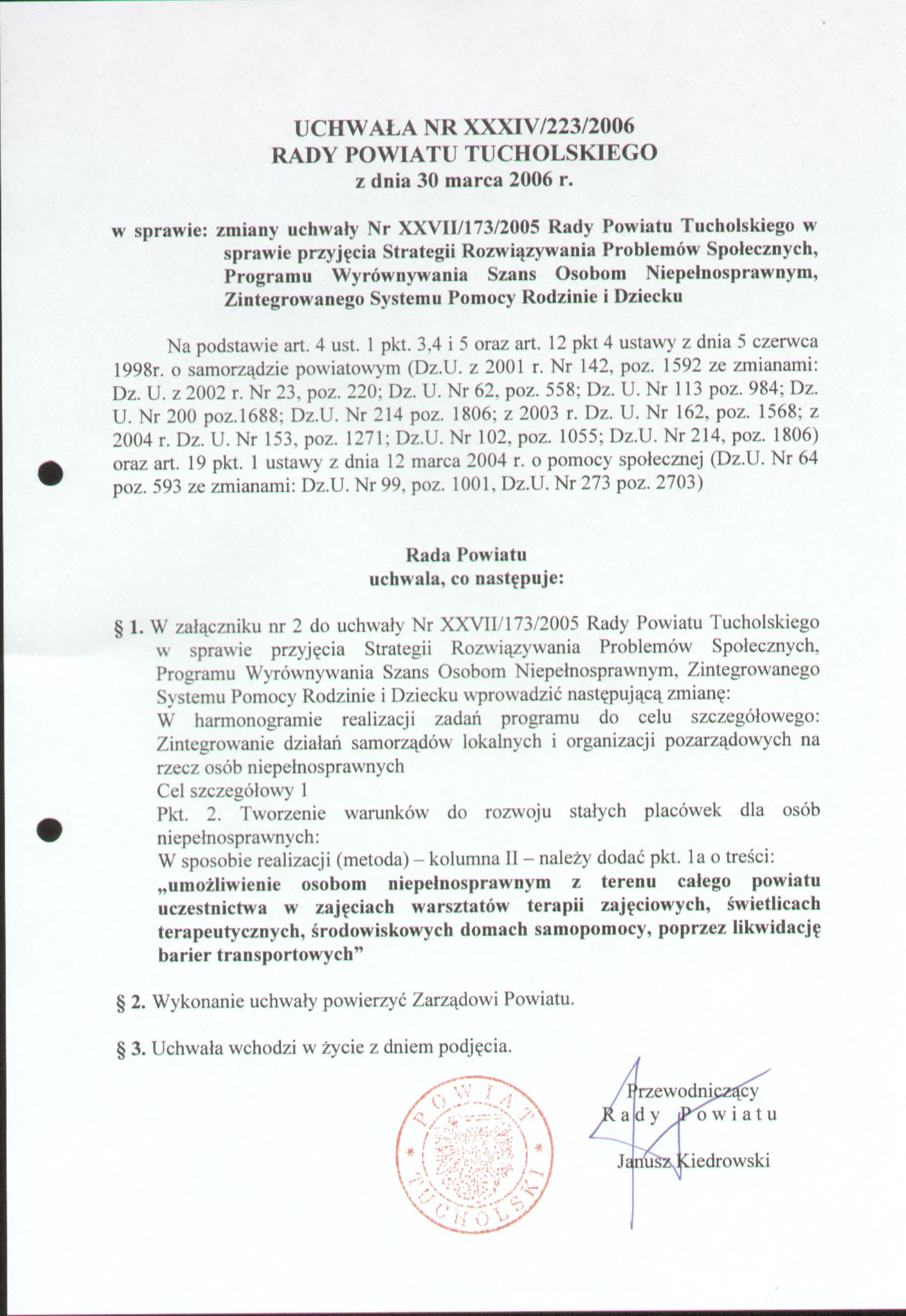 w sprawie zmiany uchwały Nr XXVII/173/2005 Rady Powiatu Tucholskiego w sprawie przyjęcia Strategii Rozwiązywania Problemów Społecznych, Programu Wyrównywania Szans Osobom Niepełnosprawnym, Zintegrowanego Systemu Pomocy Rodzinie i Dziecku