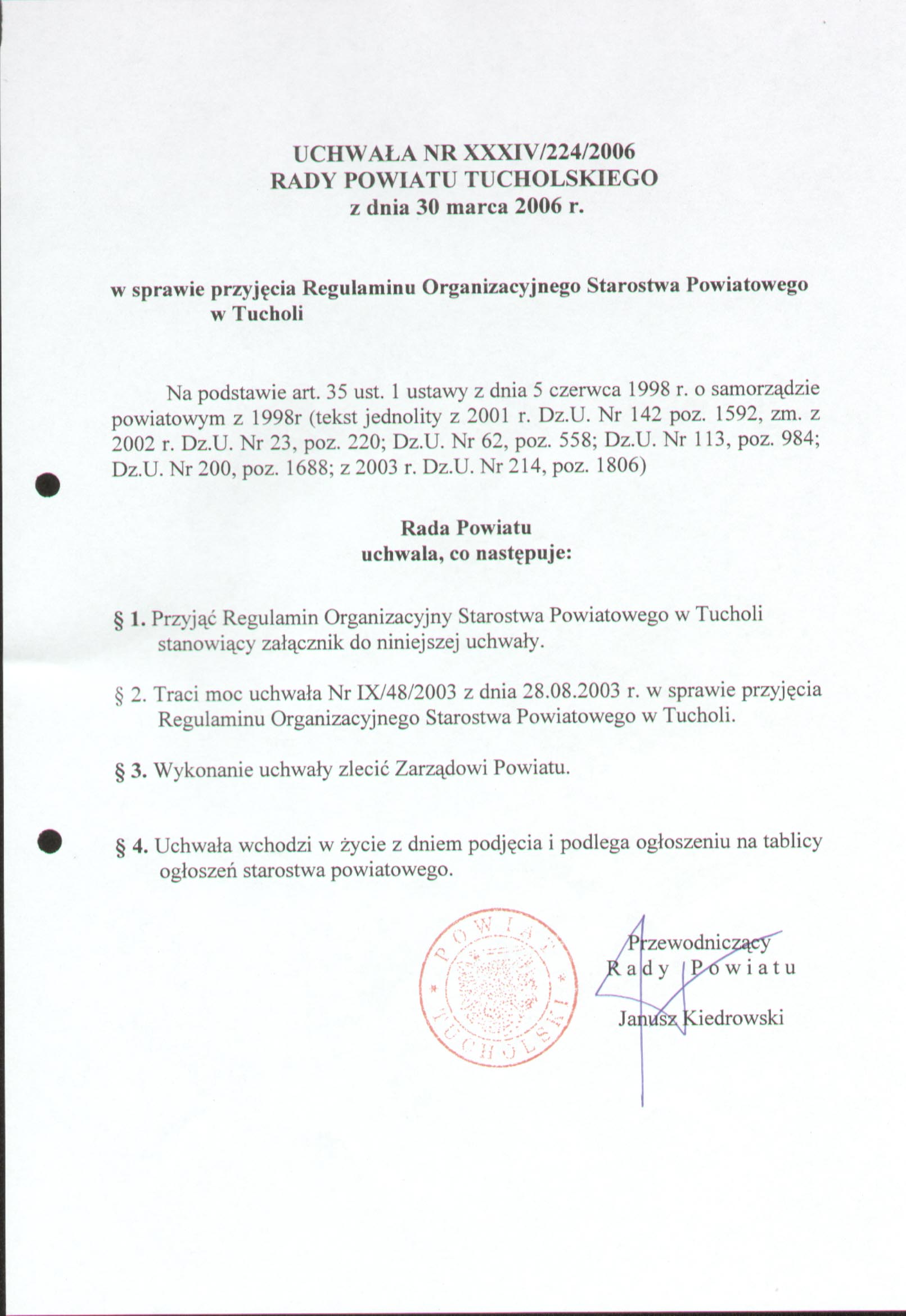 w sprawie przyjęcia Regulaminu Organizacyjnego Starostwa Powiatowego w Tucholi