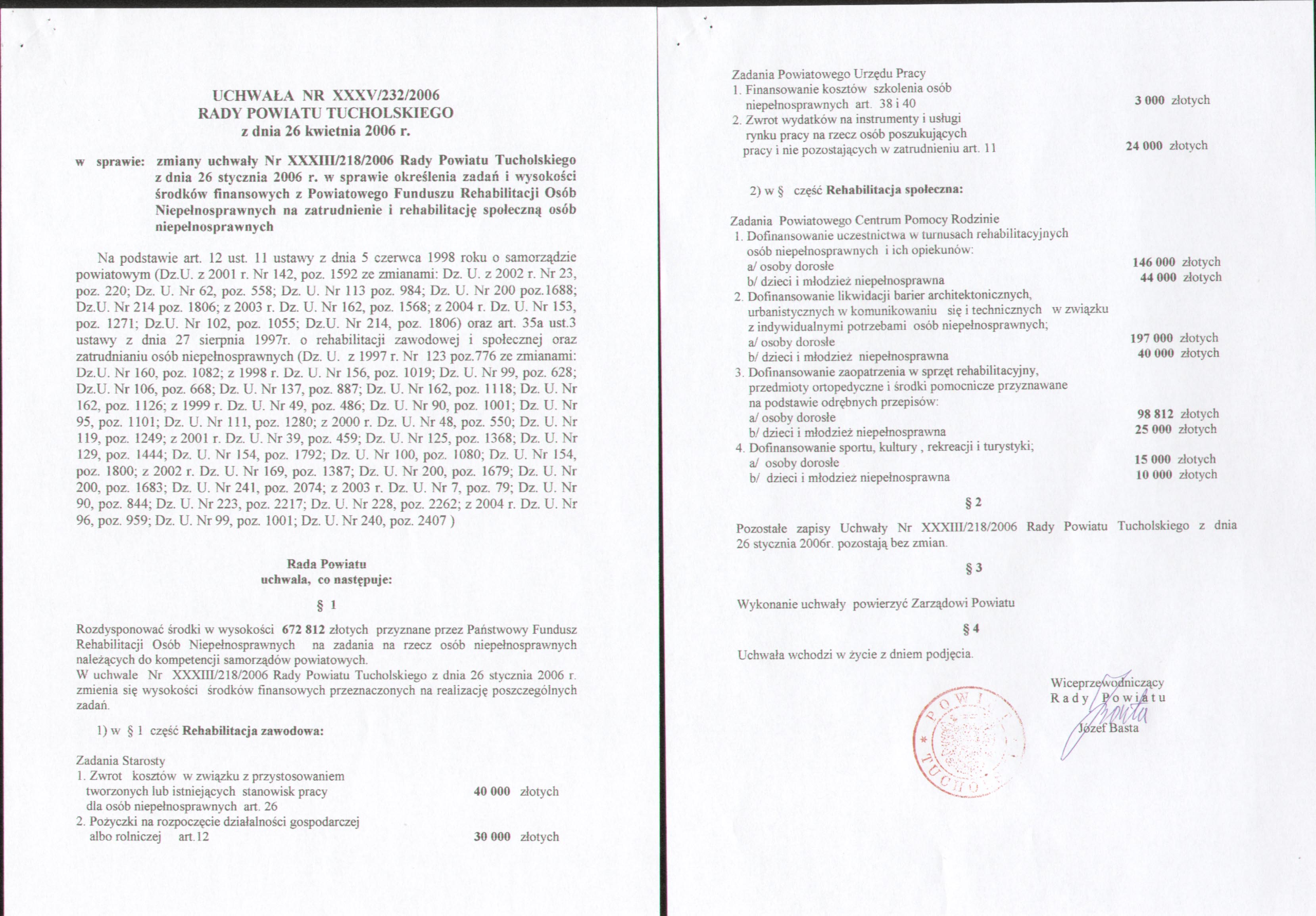 w sprawie zmiany uchwały Nr XXXIII/218/2006 Rady Powiatu Tucholskiego z dnia 26 stycznia 2006 r. w sprawie określenia zadań i wysokości środków finansowych z Powiatowego Funduszu Rehabilitacji Osób Niepełnosprawnych na zatrudnienie i rehabilitację społeczną osób niepełnosprawnych