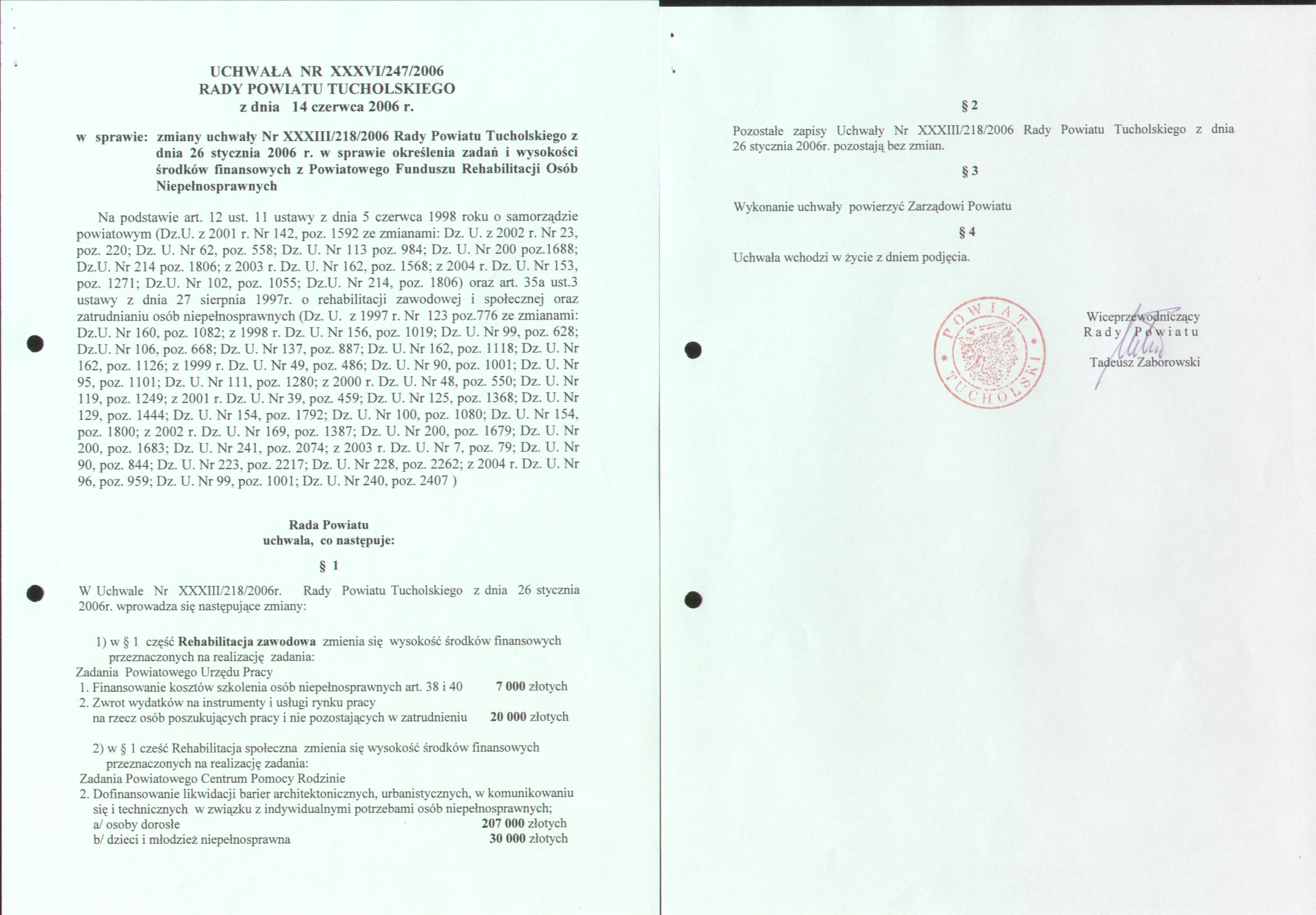 w sprawie zmiany uchwały nr XXXIII/218/2006 Rady Powiatu Tucholskiego z dnia 26 stycznia 2006 r. w sprawie określenia zadań i wysokości środków finansowych z Państwowego Funduszu Rehabilitacji Osób Niepełnosprawnych