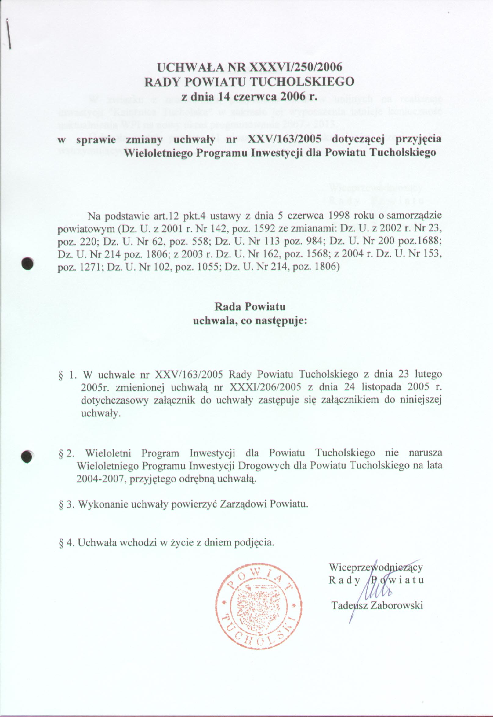 w sprawie zmiany uchwały nr XXV/163/2005 dotyczącej przyjęcia Wieloletniego Programu Inwestycji dla Powiatu Tucholskiego