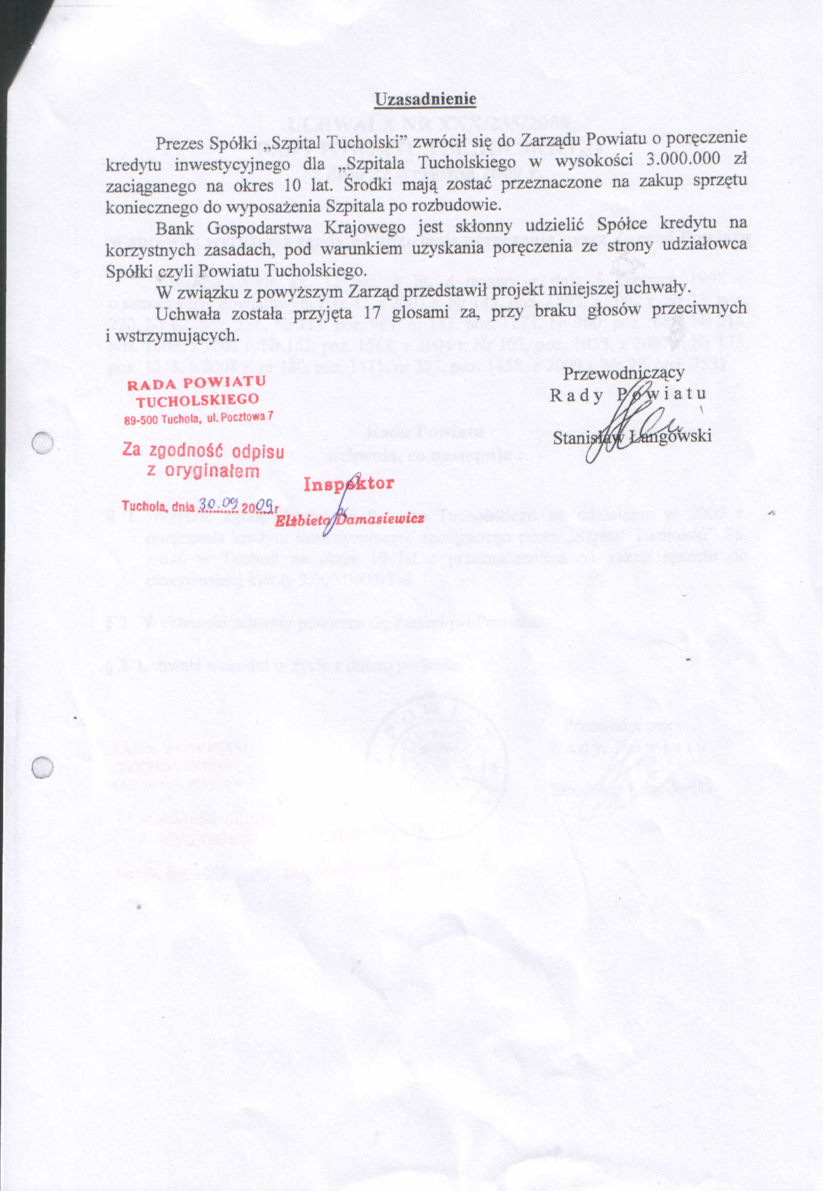 5. Zabezpieczenie kredytu: poręczenie Powiatu Tucholskiego na całość zaciągniętego kredytu.